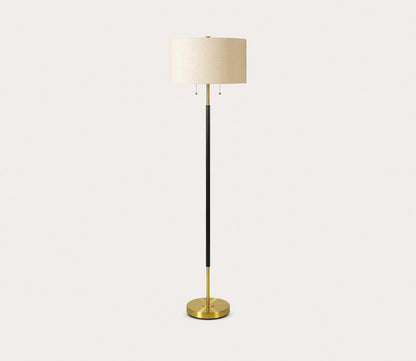 Brighten a corner or your sofa side with Surya’s Aberdeen Black and Gold Floor Lamp that conveniently switches on and off with twin pulls. With a classic design updated with modern accents, this black floor lamp features a slim metal body on a round base with luxe gold-painted accents. Standing 62-inches tall— the cream linen shade with a drum shape allows the bulb to radiate a softer, warmer light.