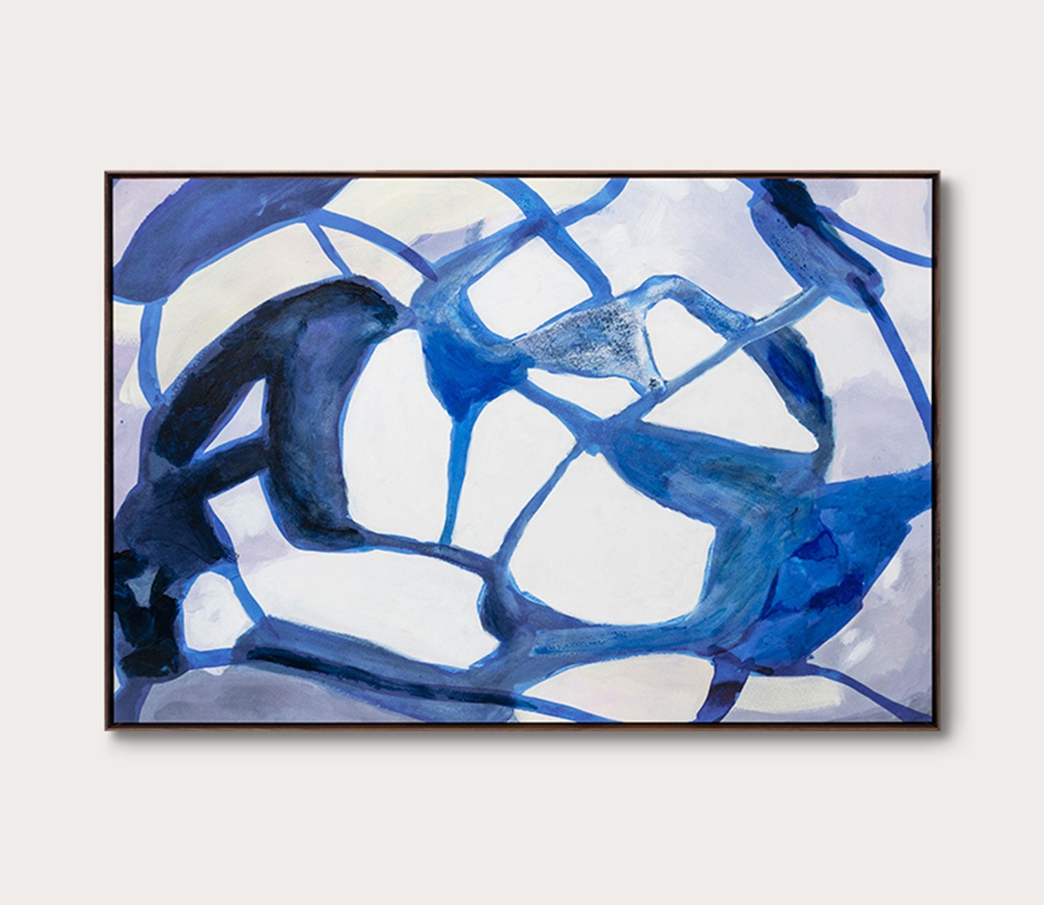 Of-the-moment yet timeless, this abstract wall art print giclee by Zoe Bios Creative depicts colorful abstractions with graphic lines and organic shapes in shades of purple, blue, grey, and white. Arriving in 26 x 38-inch or 42 x 62-inch dimensions— the stretched canvas sits in a solid walnut wood frame for high-quality, modern wall décor.