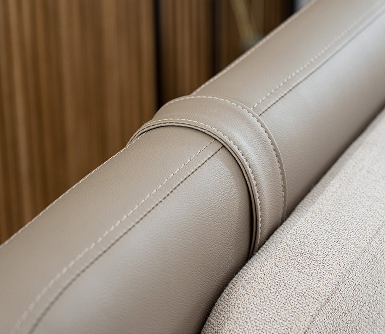 A haven of comfort and style, this low-profile platform bed features a refined design with soft taupe linen fabric, accented by a curved edge headboard and a faux leather back panel for a uniquely modern look. Crafted with thoughtful functionality, its supportive wood slats with an innovative gas hydraulic system lift your mattress effortlessly, revealing a spacious hidden storage compartment to keep your room beautifully organized.