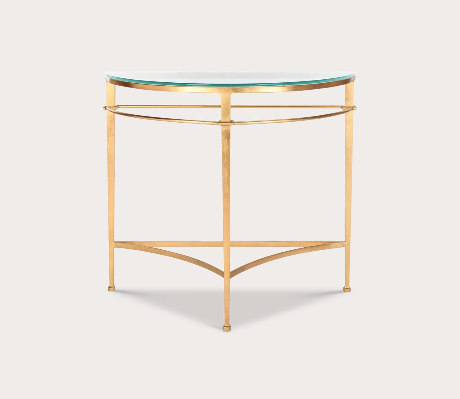 With an elegant half-circle shape, this modern entryway table features a slim-lined metal base with curving details, creating a grand entrance to any space. A timeless silhouette with refined style and versatility, the tempered glass tabletop offers a sleek and easy-to-clean surface for décor, baskets, lamps, and more.