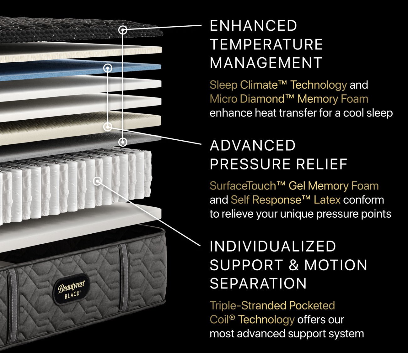 If you prefer a firm feel with lasting support, the Beautyrest Black® Series Three Extra Firm Innerspring Mattress is designed for you. A longtime best seller, it delivers unwavering support with advanced cooling and pressure relief. Cooling technology near the surface helps regulate temperature, while firm, responsive foams and latex provide sturdy, balanced comfort. Deep inside, a reinforced coil system adapts to your body and minimizes motion transfer—so you sleep soundly and undisturbed through the night.