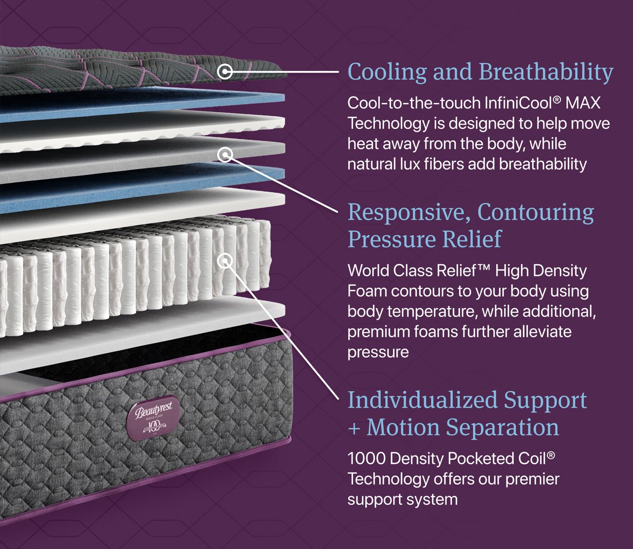 Benefits: Plush contouring comfort, responsive pressure relief, enhanced cooling breathability, individualized coil support, and motion separation.