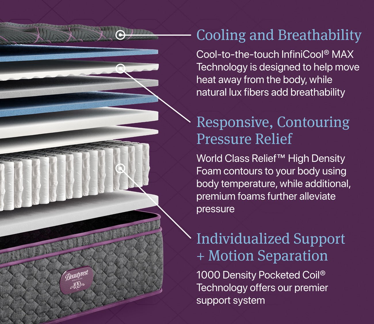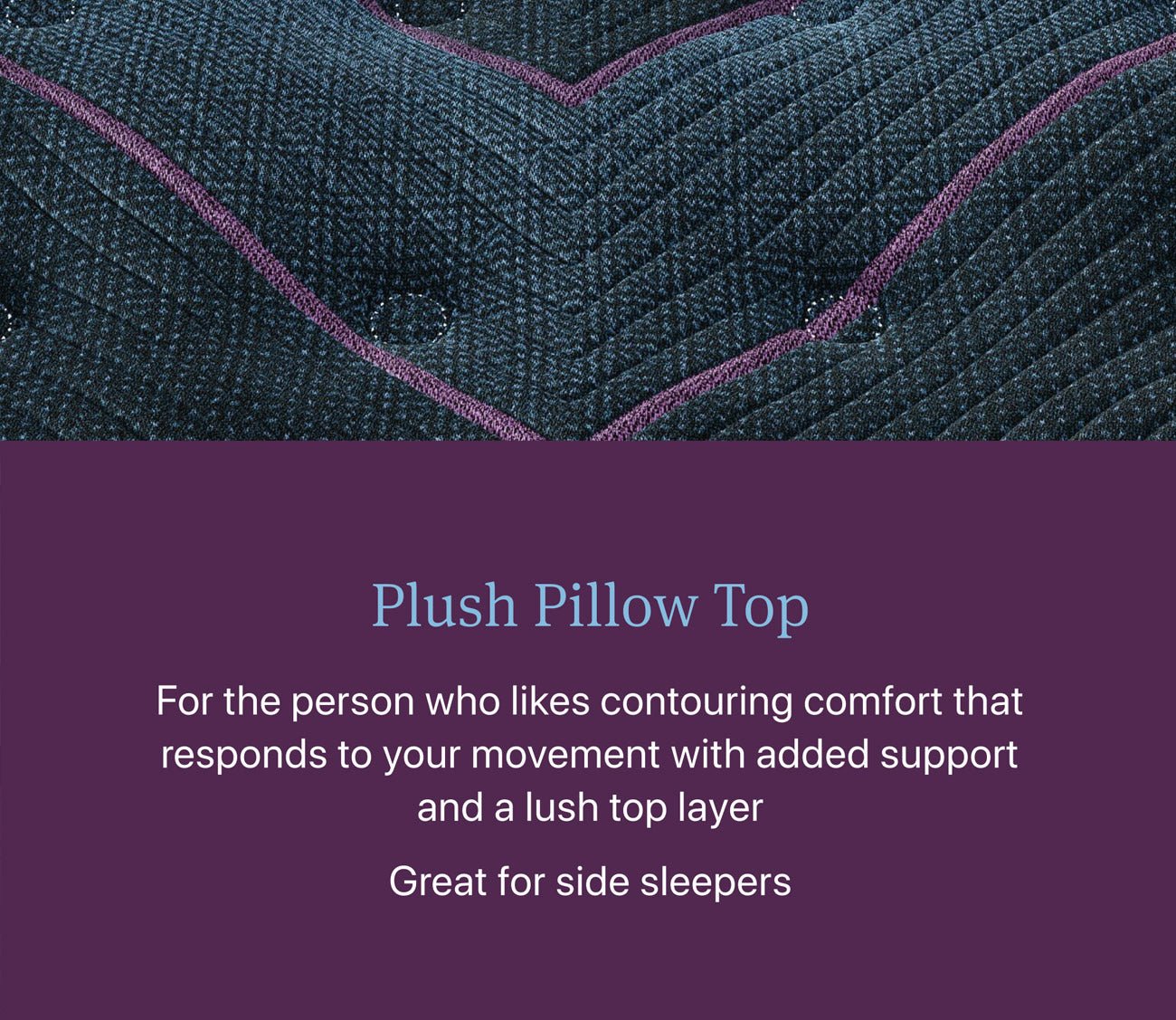 Benefits: Plush, pillow-top comfort; responsive pressure relief; advanced cooling; individualized coil support; and motion separation for undisturbed rest.