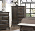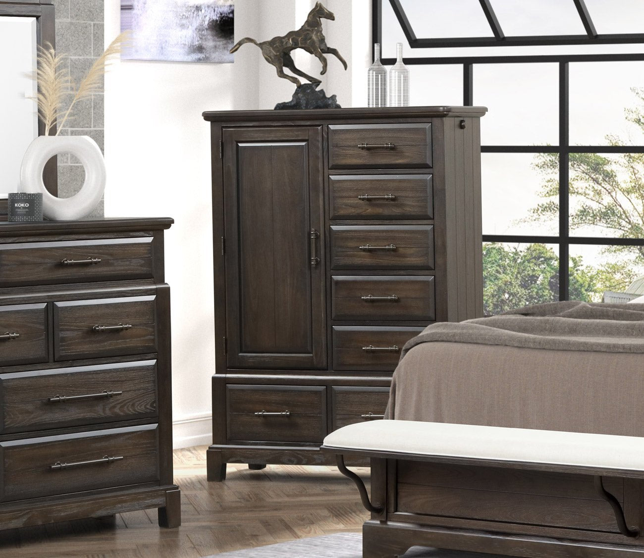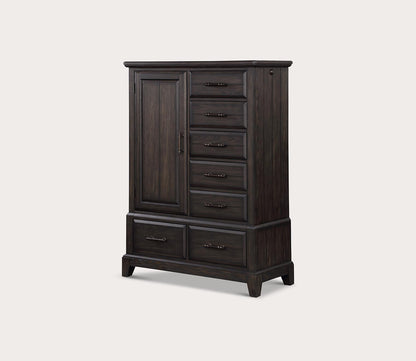 A wealth of storage and design details bring style and function to your bedroom with Bernards Furniture's Bellamy Lane Mans Door Chest, featuring a 43-inch width and 60-inch height. Exquisitely finished in rich, dark brown, this gentleman's chest includes a side door revealing adjustable shelves and seven drawers of varying sizes for optimal organization. Visible grain variation offers an elegant, rustic look over a quality elm wood veneer construction with pewter-finished bar pulls.