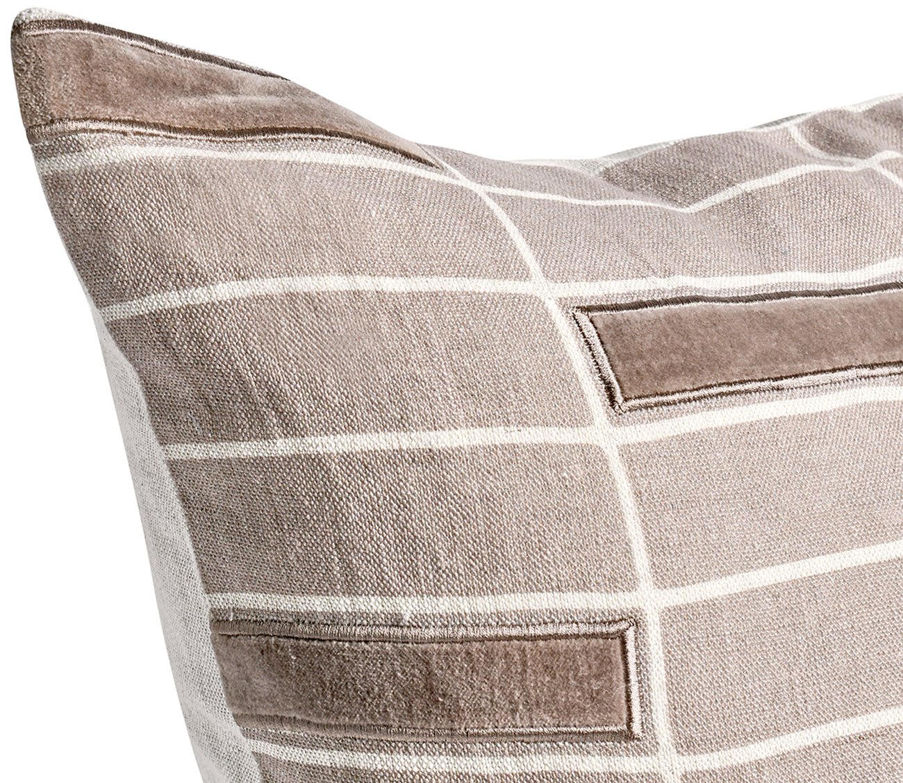 Sumptuously filled with a removable feather and down insert, this decorative accent pillow exudes refinement with a 100-percent Belgian flax linen cover showcasing a hand-screen printed design layered with velvet applique and embroidered details. The taupe tones complement various color palettes, while the exquisite combination of elements offers luxury texture and dimension.