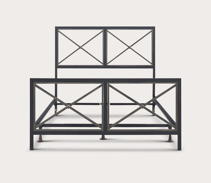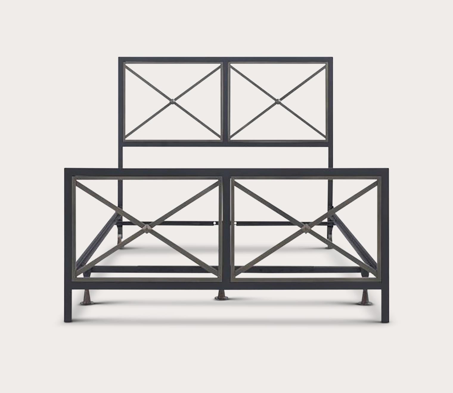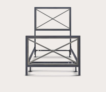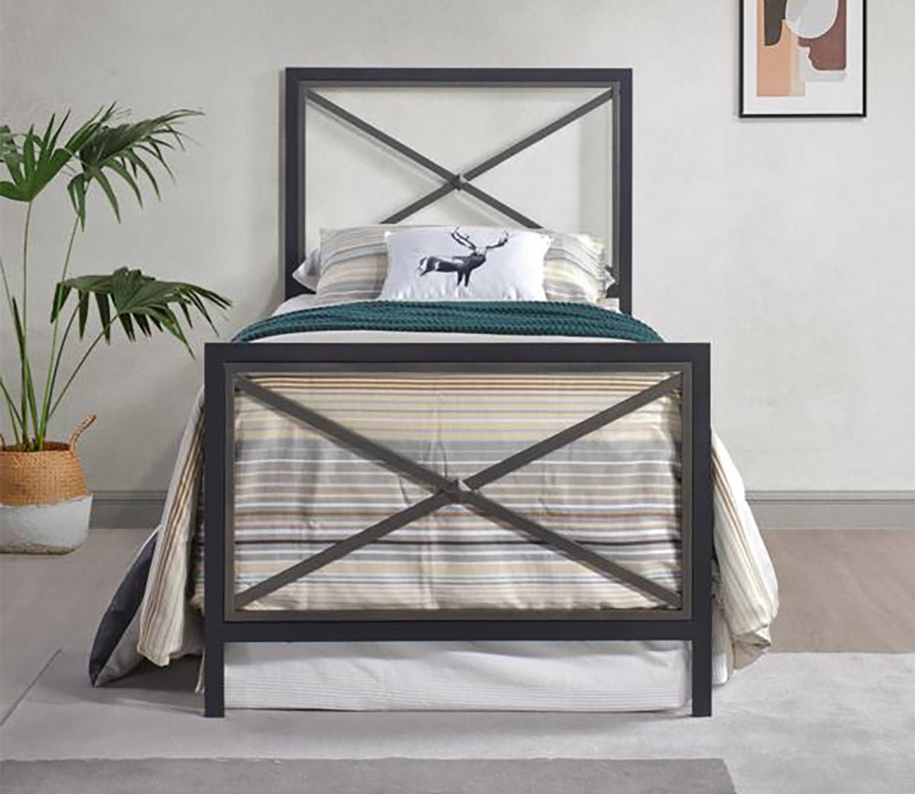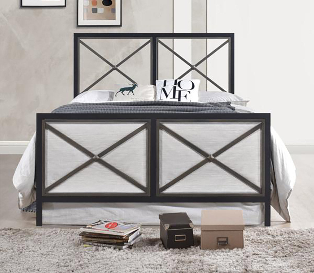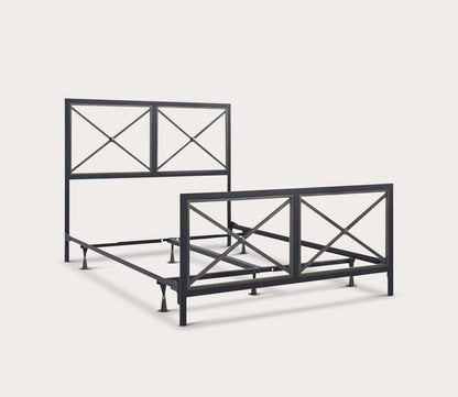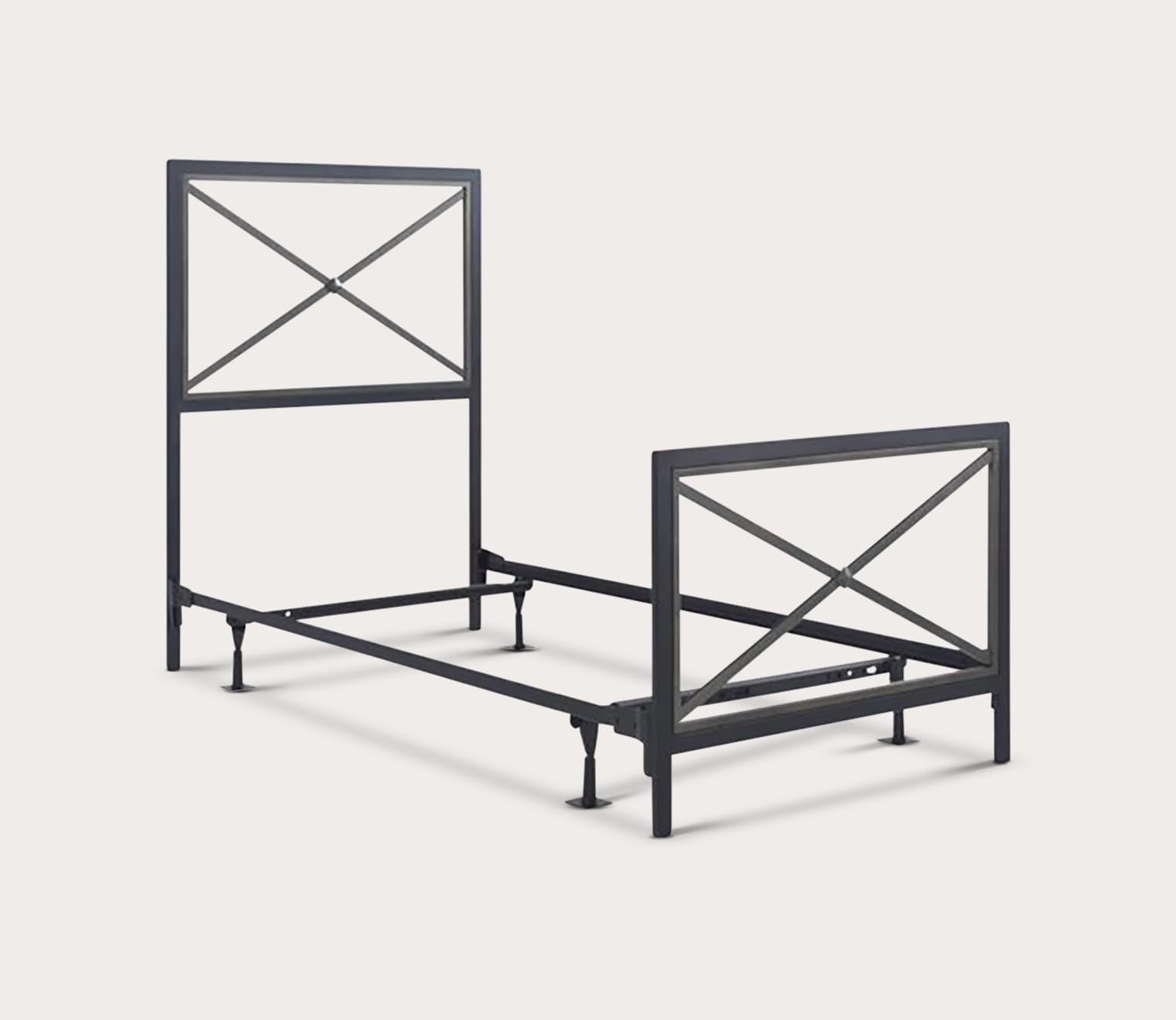 An ideal fit for bedrooms, guest rooms, apartments, and more, our Brody Metal Bed offers industrial style and sturdy mattress and box spring support. Available in twin, full, queen, or king sizes, the metal headboard and matching footboard feature a powder-coated textured black and grey bronze finish with an open frame design. Carefully crafted for extra safety and tidiness— the X-shaped cross designs within the clean-lined silhouette bring a more masculine, rustic look.