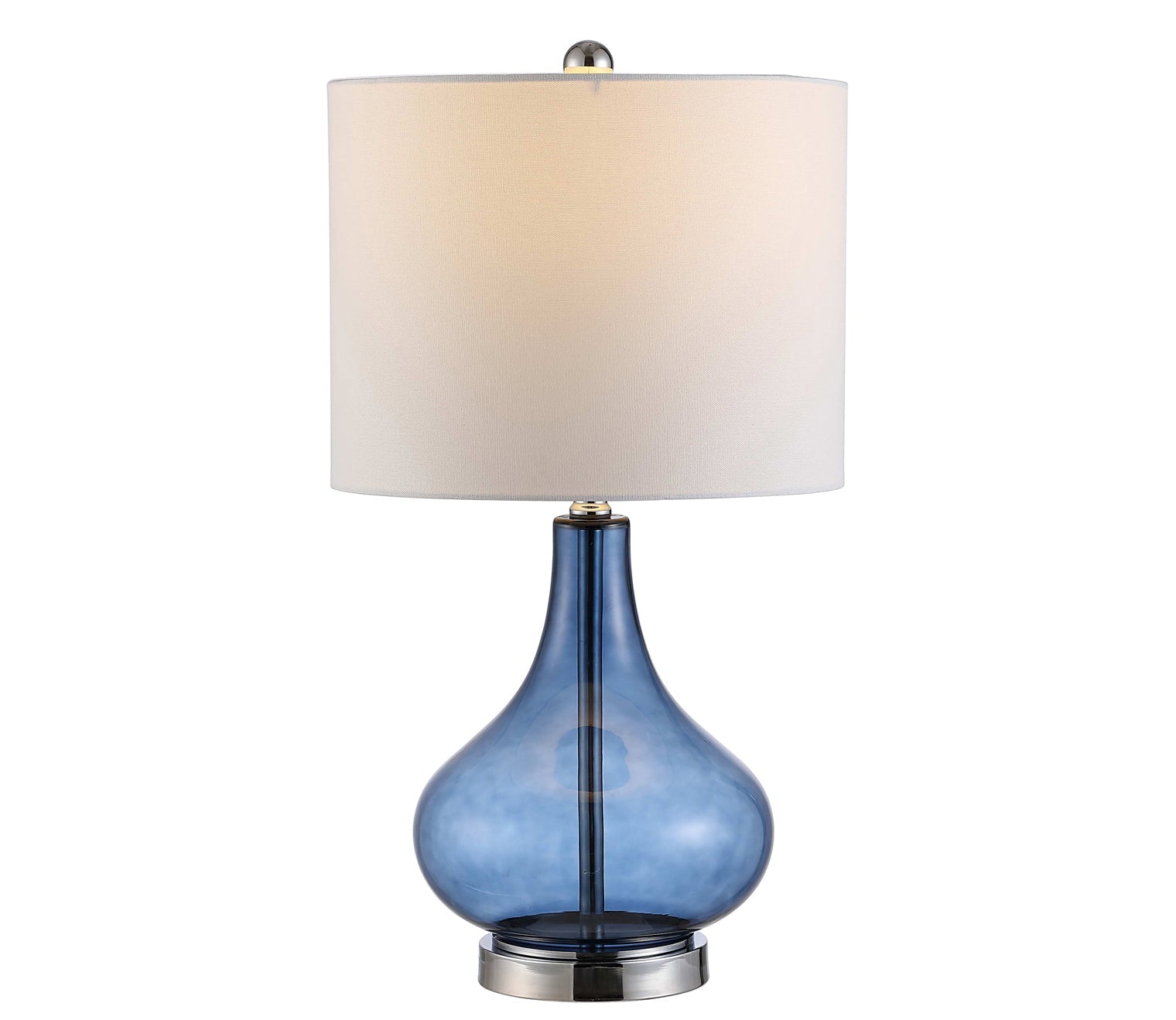 Perfect for contemporary or eclectic décor, this 24-inch decorative table lamp features a dramatically curved body crafted from clear blue glass with a white cotton drum shade.