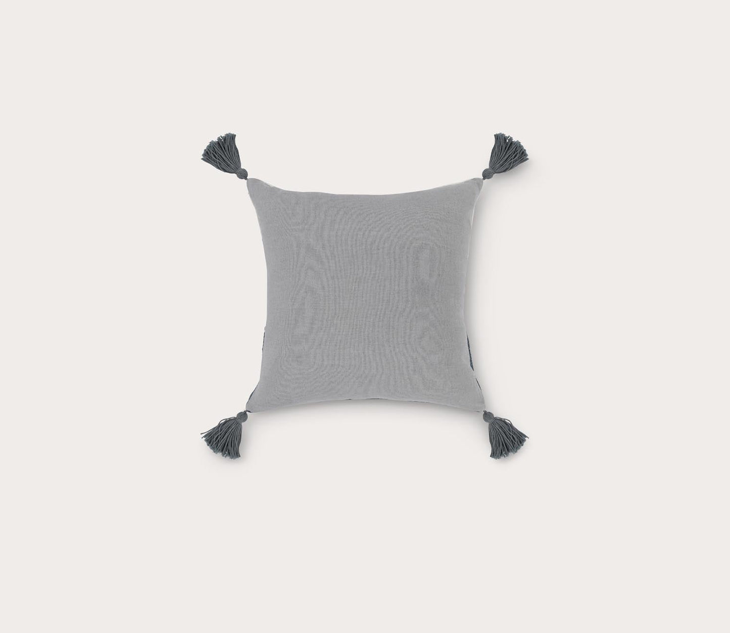 Eye-catching embellishment and artsy design make a cozy statement with Villa Home’s Carve Sea Fog Blue Ivory Throw Pillow in an 18 x 18-inch size. With adorning corner tassels and a sleek knife-edge finish, this square toss pillow features a decorative cover with a layered mix of cotton, linen, and leather hand-applied fabric pieces, including embroidery and tufting for a dimensional look. With shades of blue against an ivory ground and a natural reverse— the luxury feather and down insert creates huggable plushness from the interior.