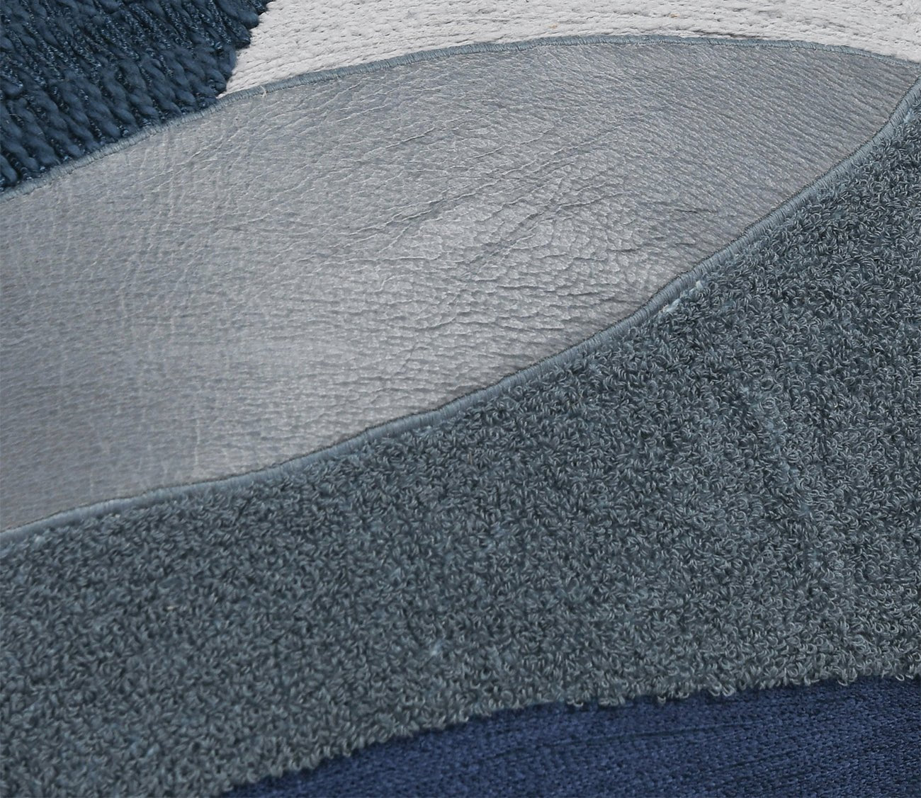 - Hand-applied and embroidered fabric pieces overlap at the front in shades of blue.