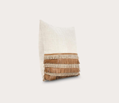 Bring bohemian flair into your bedding ensemble or sofa layers with Villa by Classic Home’s Casa Leather Chestnut Natural Throw Pillow, featuring a 20 x 20-inch square size. A stylish complement for rustic, farmhouse chic, or eclectic interiors, this decorative toss pillow includes a 100-percent cotton cover removable with a zip closure and a plush feather and down insert. Texturally intriguing with a fringe section, genuine leather and jute applique create a tiered design with light hand-applied embroidery.