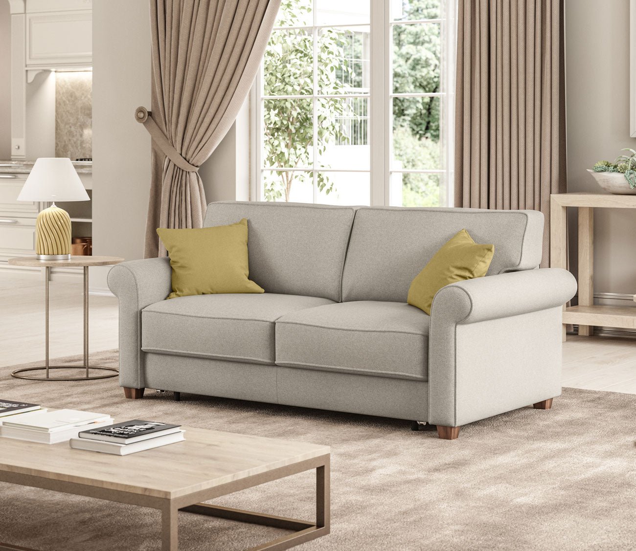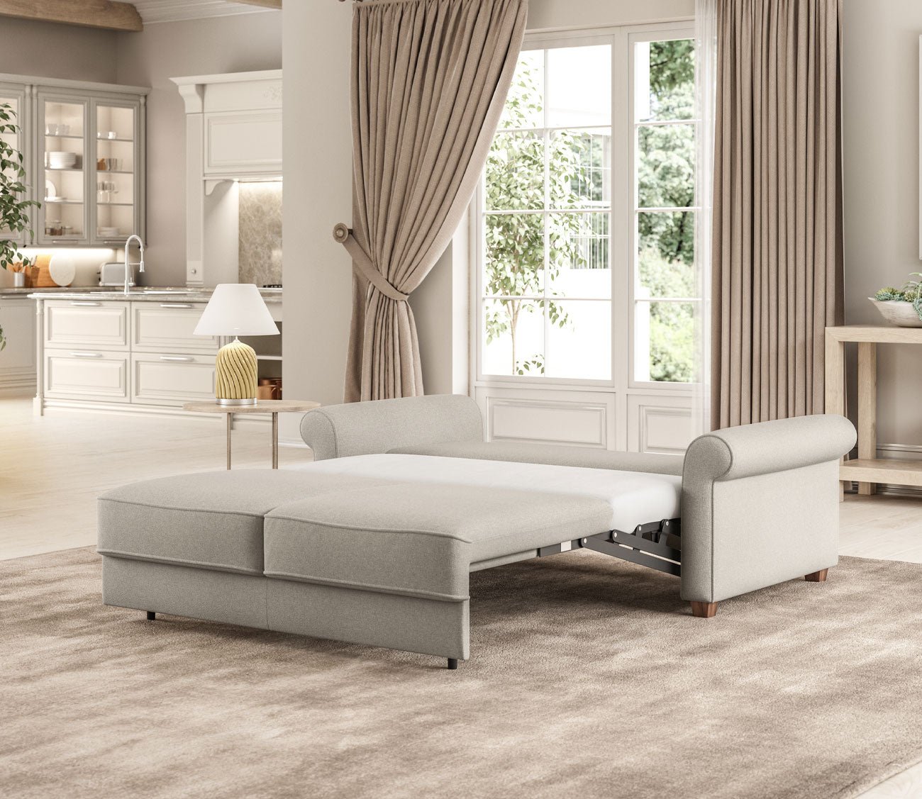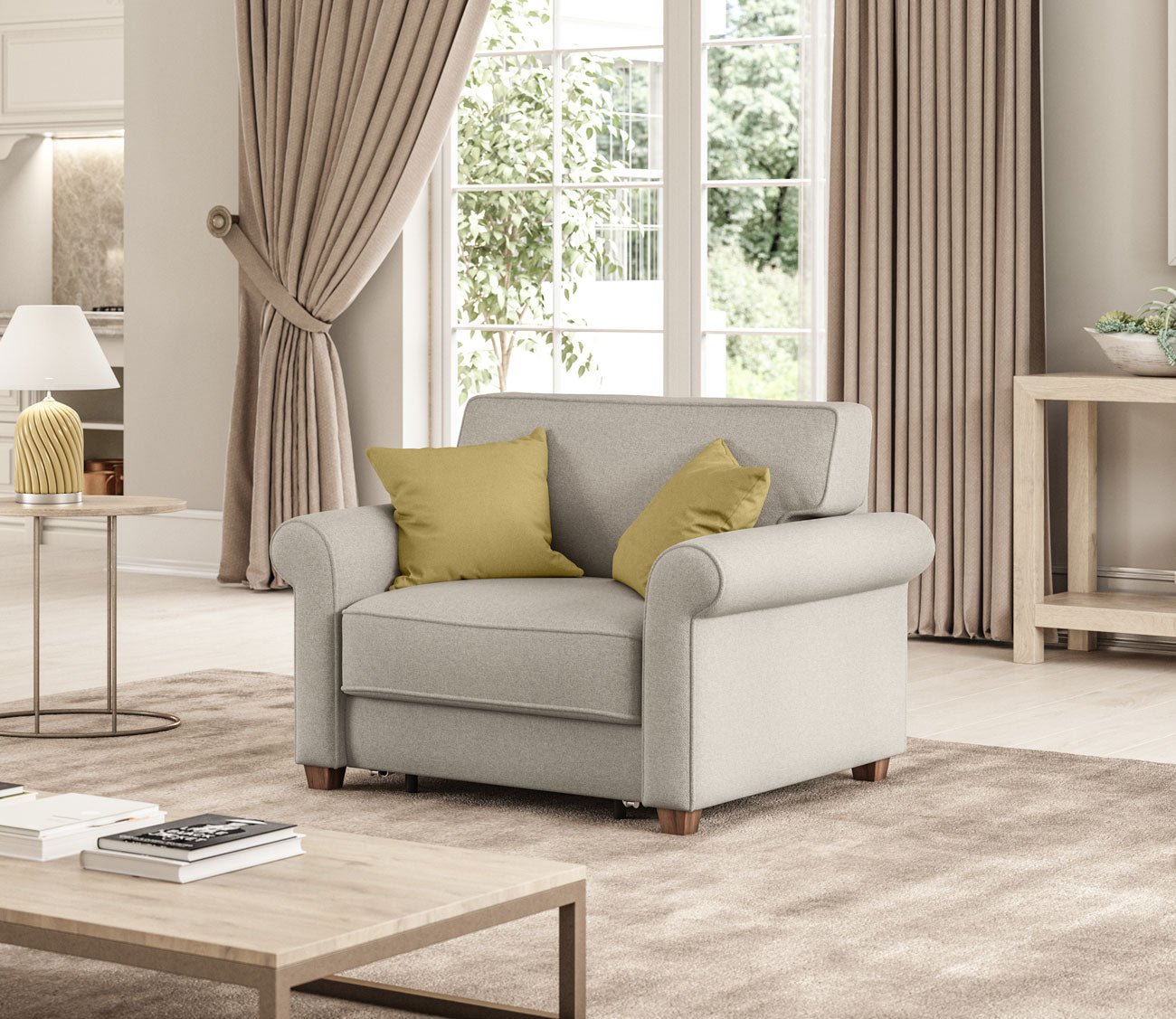Whether used as a pull-out chair or a full-size sleeper sofa, the Casey transitions effortlessly into a comfortable sleep surface using Luonto’s innovative Hybrid Function. Its timeless silhouette, complete with traditional rolled armrests, blends seamlessly