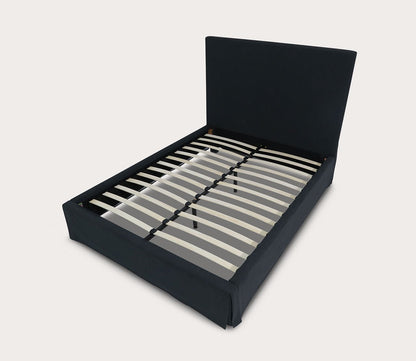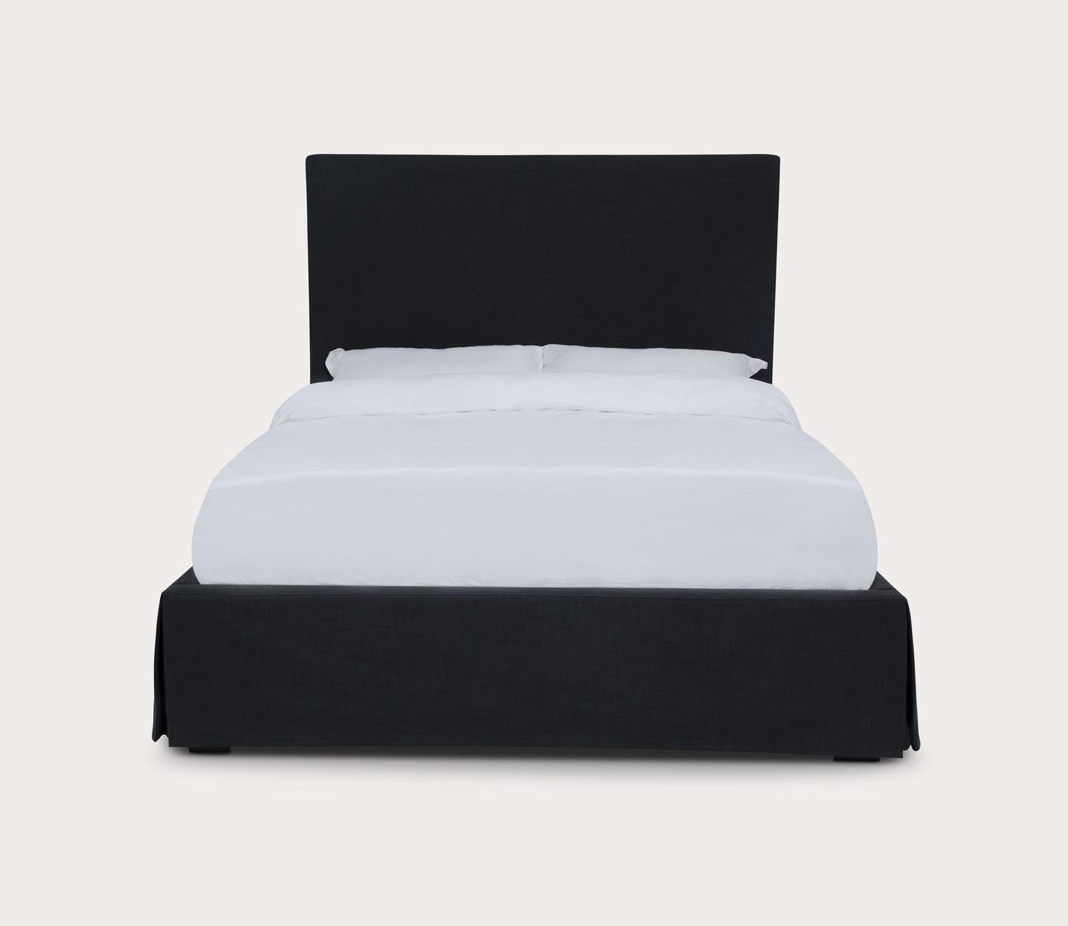 Fitting various bedroom aesthetics and elevating the atmosphere, Modus Furniture’s Cheviot Upholstered Skirted Panel Bed combines modern design with timeless, elegant style. Available in full, queen or king size, this slipcover-style platform bed features a tall headboard with a 58-inch height, durable solid wood framing, and dark iron grey-hued linen-blend fabric upholstery for a relaxed luxury look. The skirted base with inverted corner pleats adds a sleek and chic touch, while European-style bentwood slats directly support your mattress— no box spring necessary.