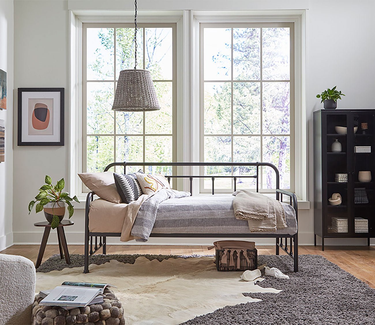 Perfect for a den, home office, guest room, or child’s bedroom, this daybed frame exudes industrial charm with a carbon steel construction in a textured black or white finish. The openwork silhouette creates a light, airy feel, while the curved side rails seamlessly morph into the top rail for contemporary flair alongside detailed castings throughout.