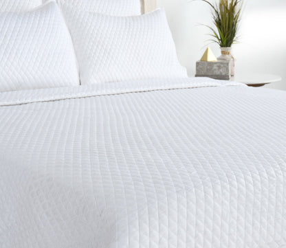 A modern take on timeless bedding layers, Villa Home’s Diamond White Sateen Quilt in queen or king size brings a textural touch and extra comfort to your coastal retreat. Machine washable for worry-free laundering, this quilted bed blanket features matte polyester sateen fabric in solid bright white with all-over diamond-stitch quilting for subtle loft and dimensional intrigue. Whether on its own for warm summers or layered for colder nights and a well-styled ensemble— sateen binding and mitered corners finish for high-quality, tailored craftsmanship.