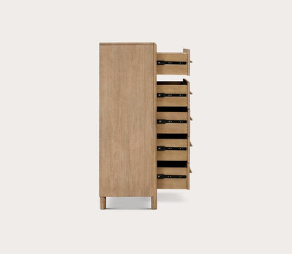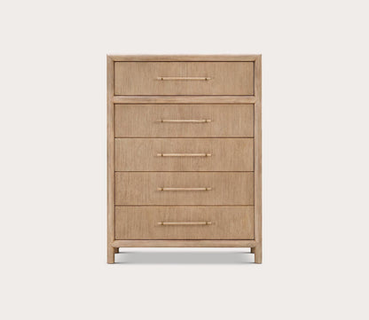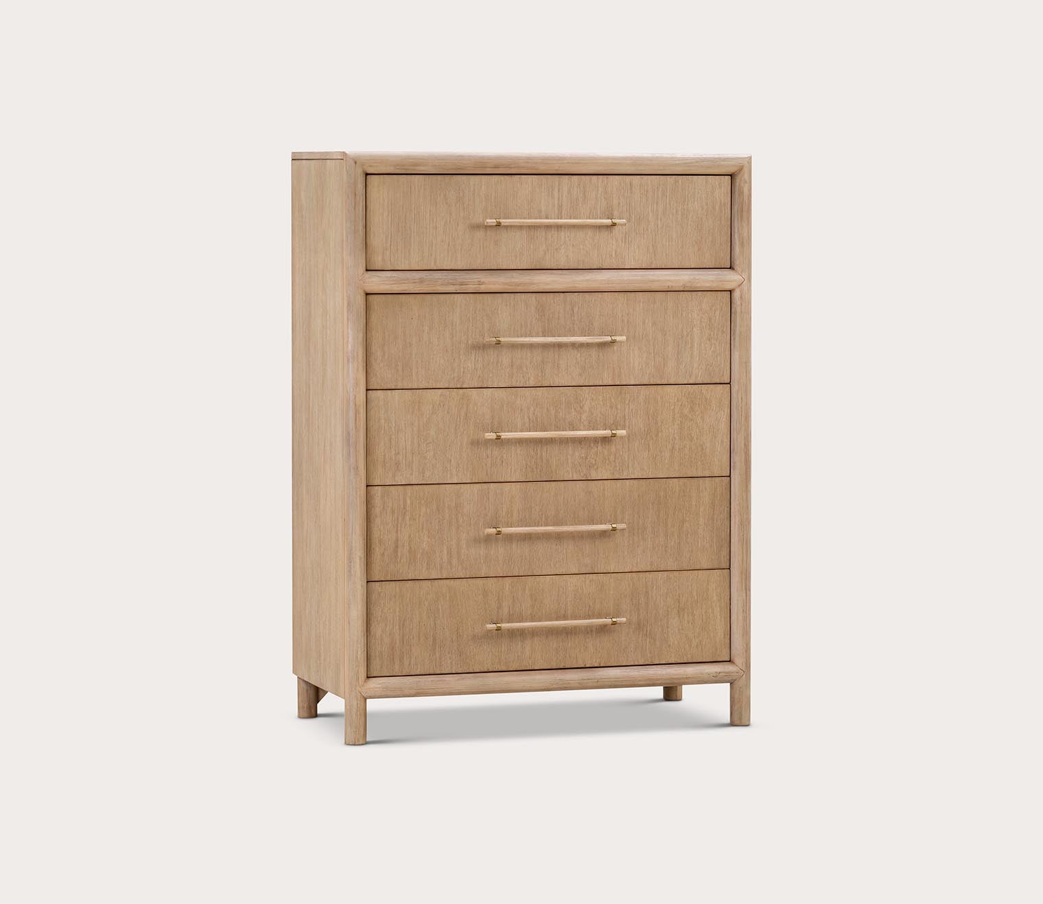 Whether you’re looking to upgrade your bedroom storage or enhance your space’s design, Modus Furniture’s Dorsey 5-Drawer Chest makes a perfect addition on its own or with the entire furniture set. Including removable felt liners in the top drawers to protect delicates, this 54-inch-tall chest of drawers features a vertical silhouette crafted from solid acacia wood and veneers in a patina-inspired wire-brushed finish. Thick, round framing creates a smooth profile for a contemporary look, while elongated wooden drawer pulls contribute to the storage chest’s modern design.