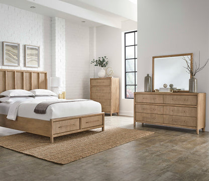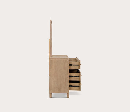 A contemporary coastal-style addition to upgrade your bedroom ensemble, Modus Furniture’s Dorsey 6-Drawer Double Dresser provides practical storage solutions and a modern organic design. Finished in a soft, natural tone with patina-inspired wire-brushing, this 66-wide dresser features a solid acacia wood and veneer construction with exposed vertical graining and English dovetail drawer joinery. Removable felt liners in the top drawers offer optional protection for delicates, while the thick, round framing creates a smooth silhouette.