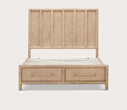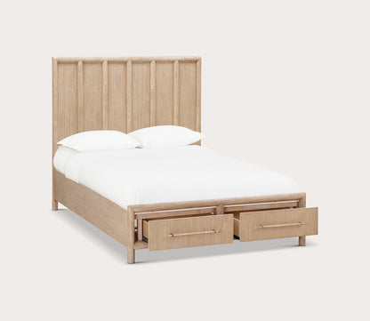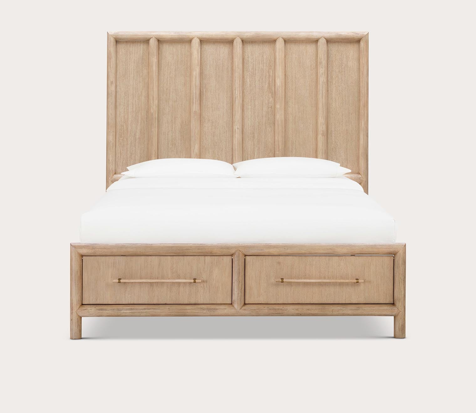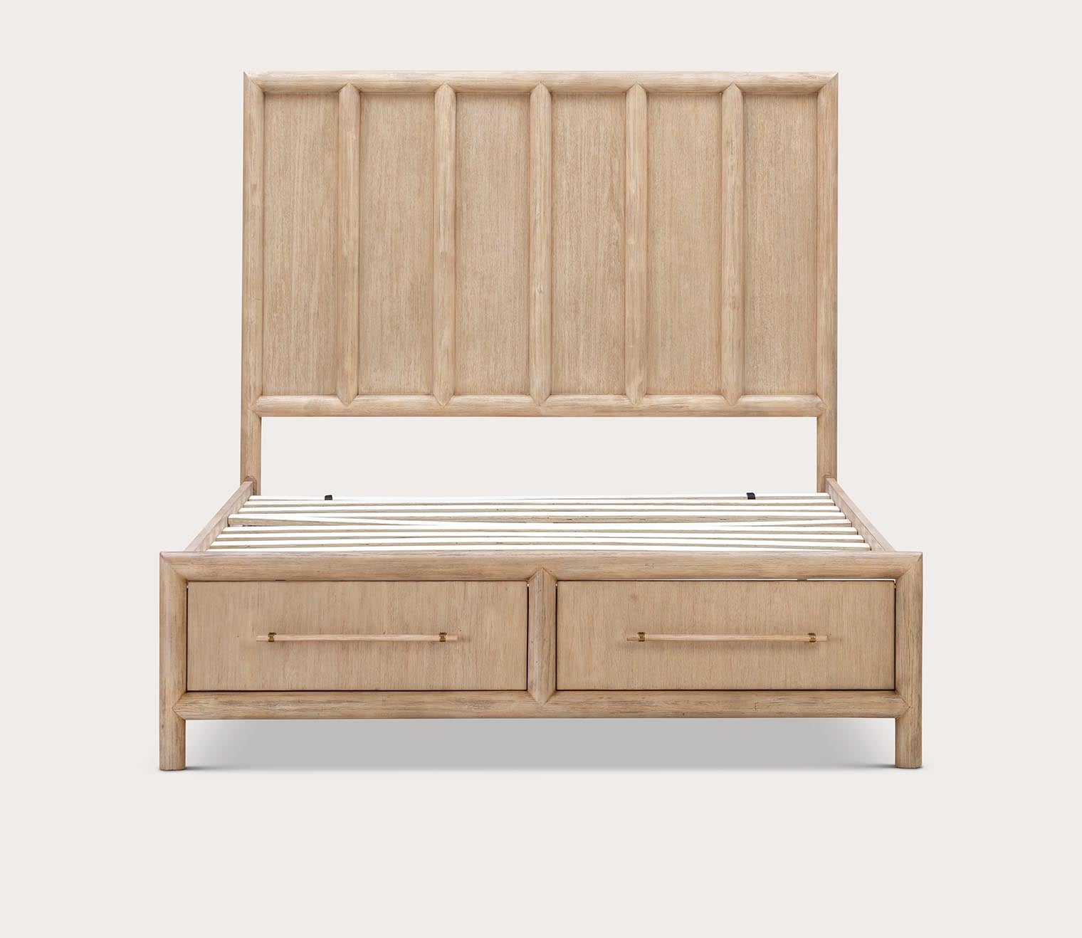 Elevate your sleep sanctuary with Modus Furniture’s Dorsey Wood Storage Bed that harmoniously blends fashion, form, and function. Available in queen or king size, this platform bed crafted from solid acacia wood and veneers provides durable mattress support without needing a box spring and maximizes storage solutions with the 2-drawer footboard. Finished in a soft, natural tone with patina-inspired wire-brushing— thick, round framing creates a smooth silhouette, and the 60-inch-tall headboard showcases vertical sections that draw the eye upwards.