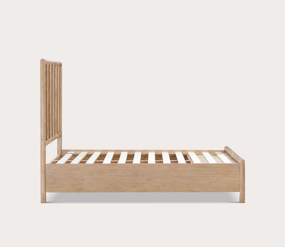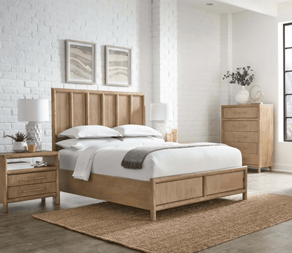 A stunning addition to any contemporary bedroom ensemble, Modus Furniture’s Dorsey Wooden Panel Bed combines quality construction with modern design elements. Available in queen or king size, this platform bed crafted from solid acacia wood and veneers offers durable mattress support without needing a box spring. Featuring a wire-brushed finish to give the look of naturally weathered wood in a soft, natural brown tone— the 60-inch-tall headboard and matching 18-inch-tall footboard showcase a vertical panel design separated by thick, round framing that creates a smooth silhouette.