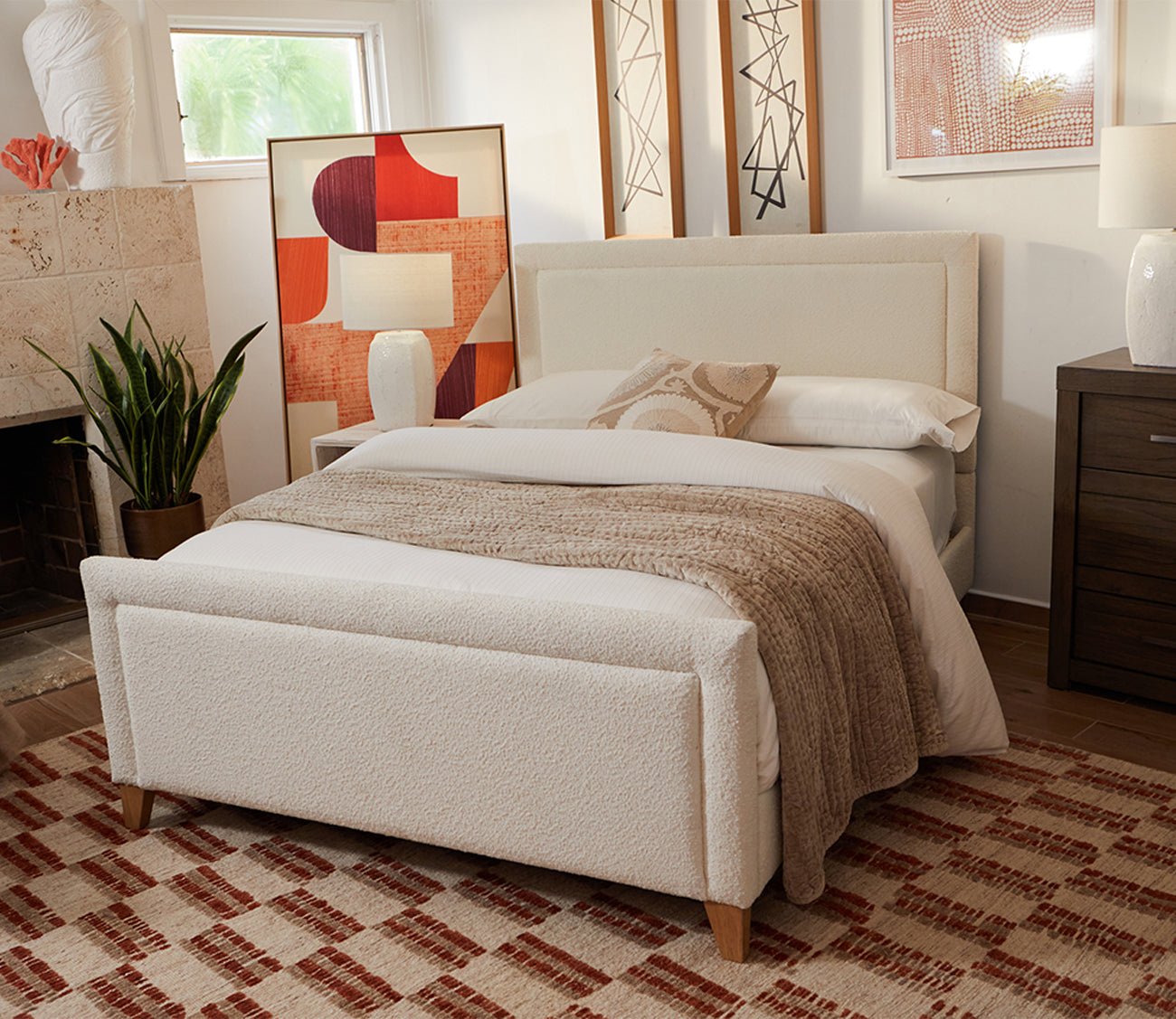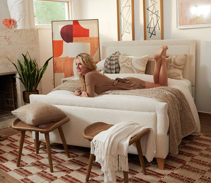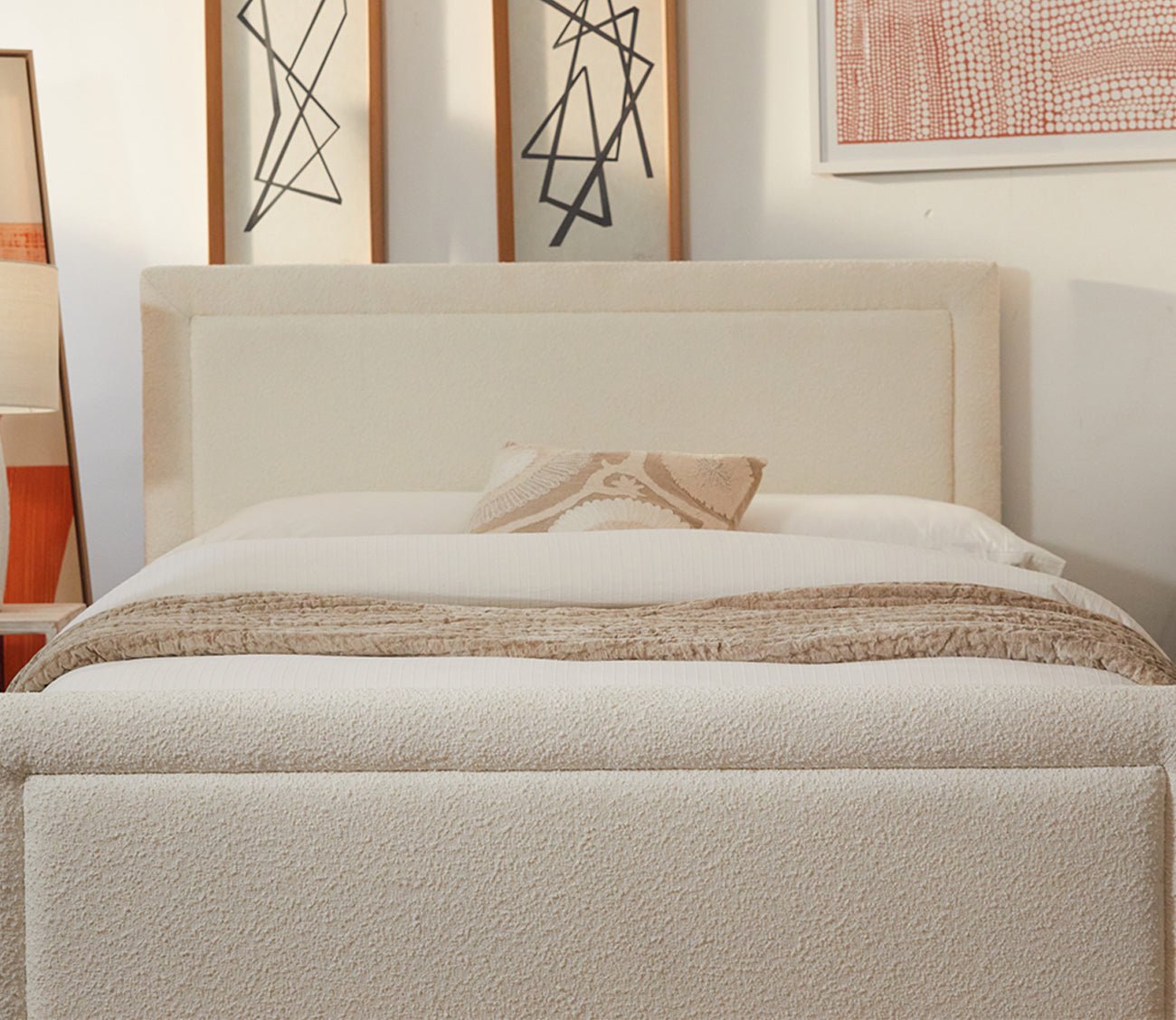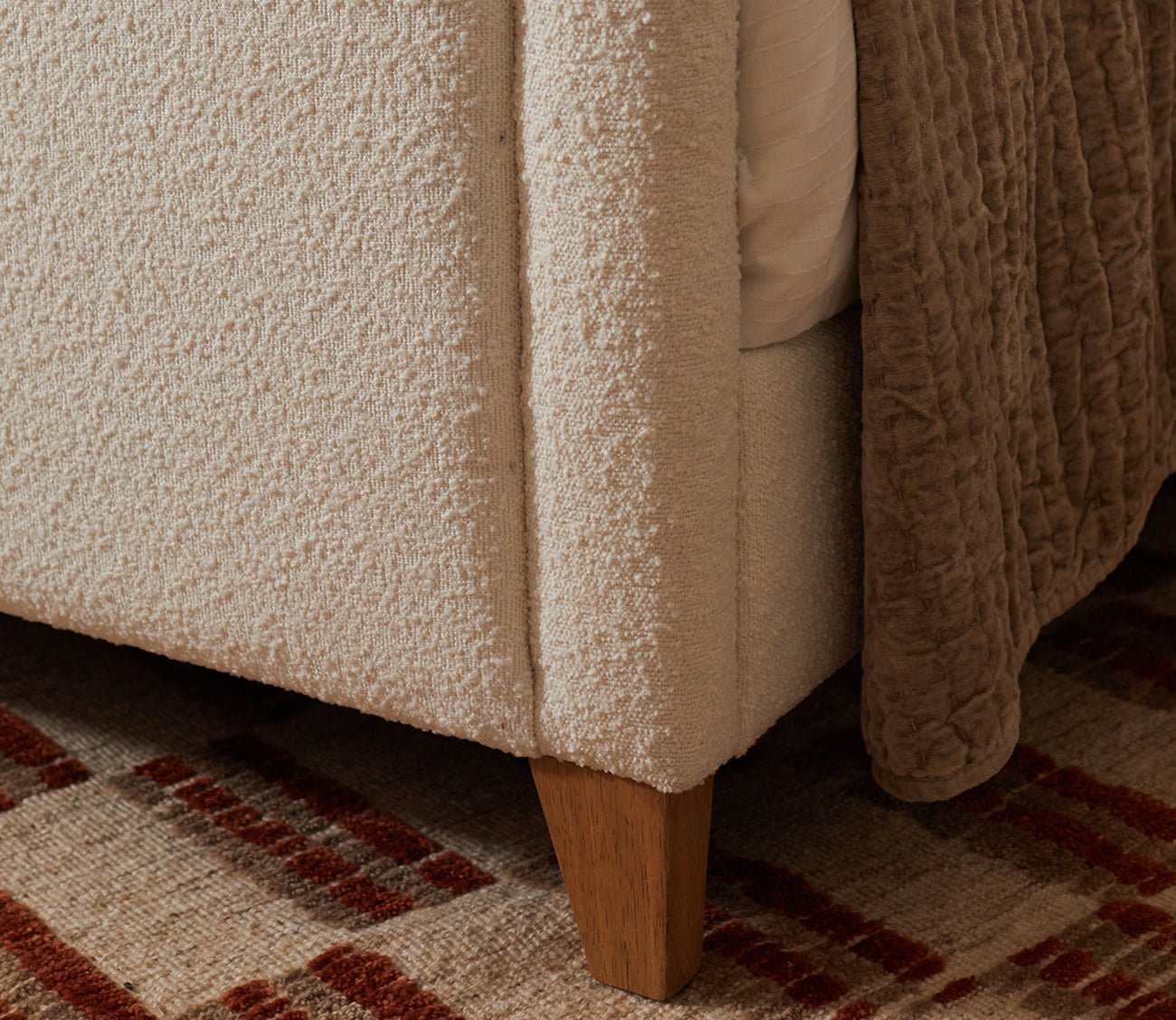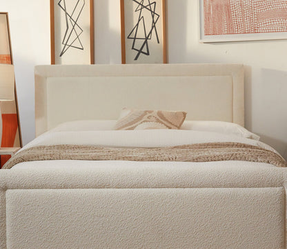 Softly textured for a cozy feel and modern style, our CM Home™ Dover Boucle Upholstered Bed fits various aesthetics and color palettes with its versatile, neutral design. Available in queen or king size with a minimal, clean-lined silhouette, this white boucle complete bed includes a 49.5-inch-tall headboard and matching footboard with frame-style stitching that enhances the plush look. Fully upholstered in performance-treated fabric upholstery with stain-resistant properties— the slatted base creates a sturdy platform and directly supports your mattress with unitized wood slats.