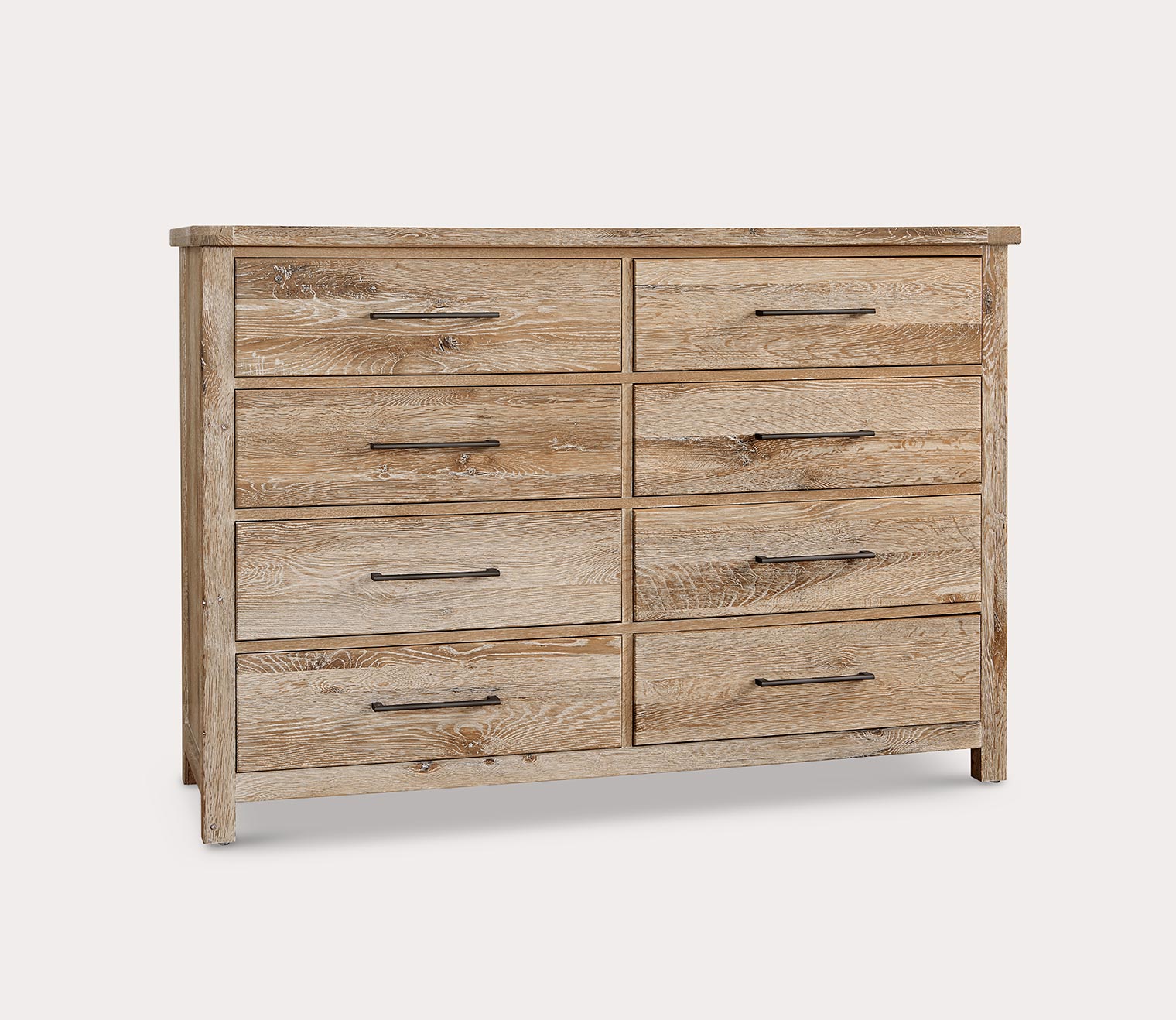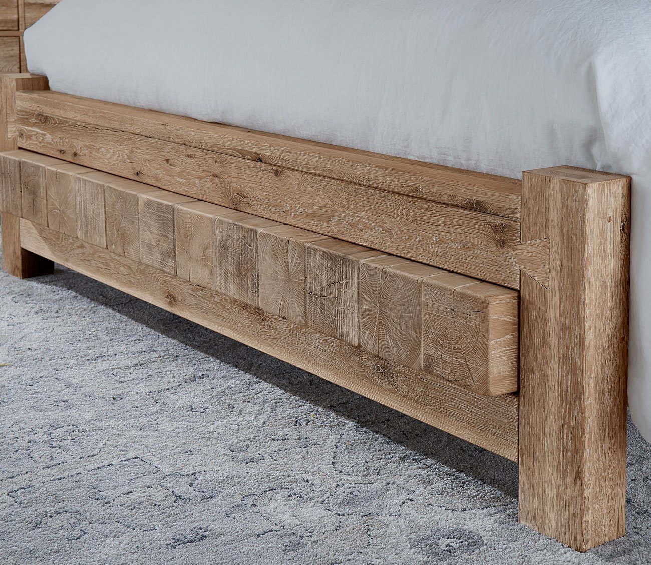 Arriving with 3-pieces, 4-pieces, or 5-pieces, including a 2-drawer nightstand, 8-drawer dresser, or 5-drawer chest, the sun bleached white or grey finish over American oak solids and oak veneers further highlights the grain variations, splits, and knots. Uniquely made with a signature footboard of 6 x 6-inch square timbers, the low-profile bed and matching storage case pieces showcase prominent dovetail joinery techniques at the bedposts and rims.