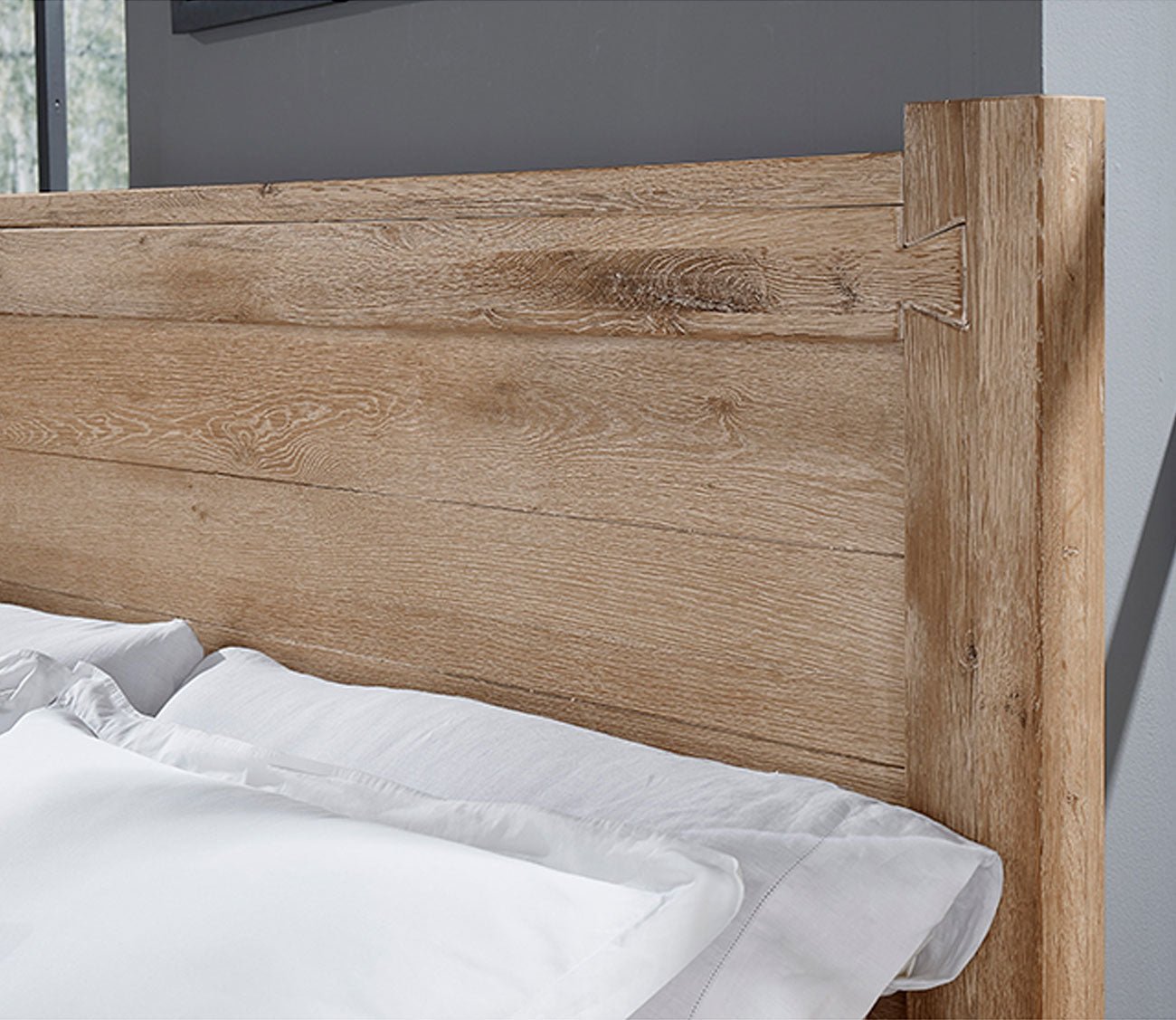 Arriving with 3-pieces, 4-pieces, or 5-pieces, including a 2-drawer nightstand, 8-drawer dresser, or 5-drawer chest, the sunbleached white or grey finish over American oak solids and oak veneers delivers time-tested quality with exposed splits, cracks, and knots. Dominant dovetail joinery techniques near the top of each bedpost and rim of each case piece showcase integrity, while ultra-smooth drawer interiors and self-closing guides enhance the functionality of the storage pieces.