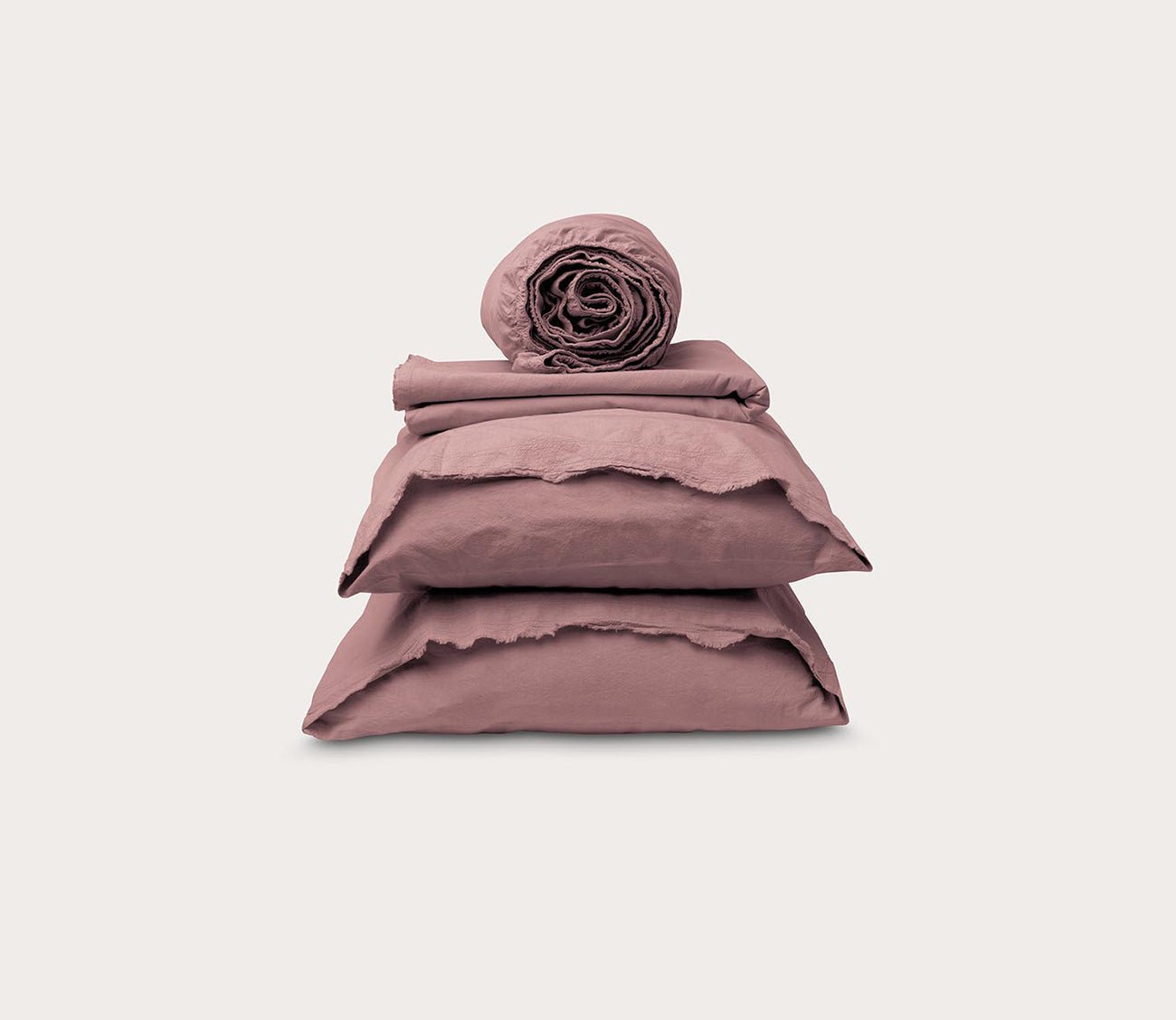 Weil Garment Washed Percale Sheet Set, available in solid ecru, desert sand, ochre, or pink sandstone. Inherently durable and breathable with a crisp percale weave, these 100-percent cotton bed sheets and pillowcases are loomed in Portugal and responsibly dyed with EarthColors®, making each bedding set unique. Including Precision-Fit® details for a secure and generously sized fit, the raw-edge design and soft texture bring that coveted lived-in look and feel.