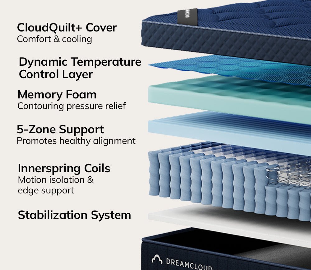At the surface, DreamCloud’s upgraded cashmere-blend quilt creates an instantly plush, breathable feel, while contouring comfort layers gently cradle the body to relieve pressure at the shoulders, hips, and back. Beneath, a zoned pocketed coil system responds independently to movement, promoting proper spinal alignment and minimizing motion transfer. The result is a luxurious, hotel-inspired sleep experience that combines softness, support, and temperature regulation in perfect harmony. Conveniently delivered in a compact box, this mattress is designed for effortless delivery, setup, and room-to-room placement.
