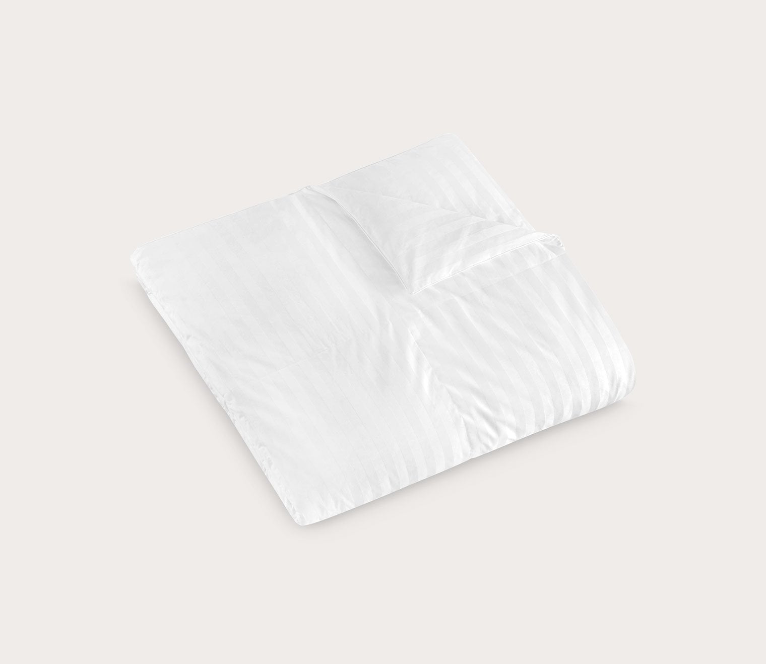The weight and loft of a luxurious feather duvet, with all-season warmth— the Eddie Bauer® baffle box down comforter brings classic comfort to your suite. This white duvet features specially-filled baffle box chambers of premium duck down, ensuring even distribution across the entire surface. With a pure cotton shell, the damask stripe pattern provides simple elegance, eliminating the necessity of a duvet cover. The smaller dimensions lend tailored styling and prevent excess fabric draping creating an elevated, modern look.