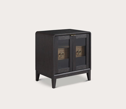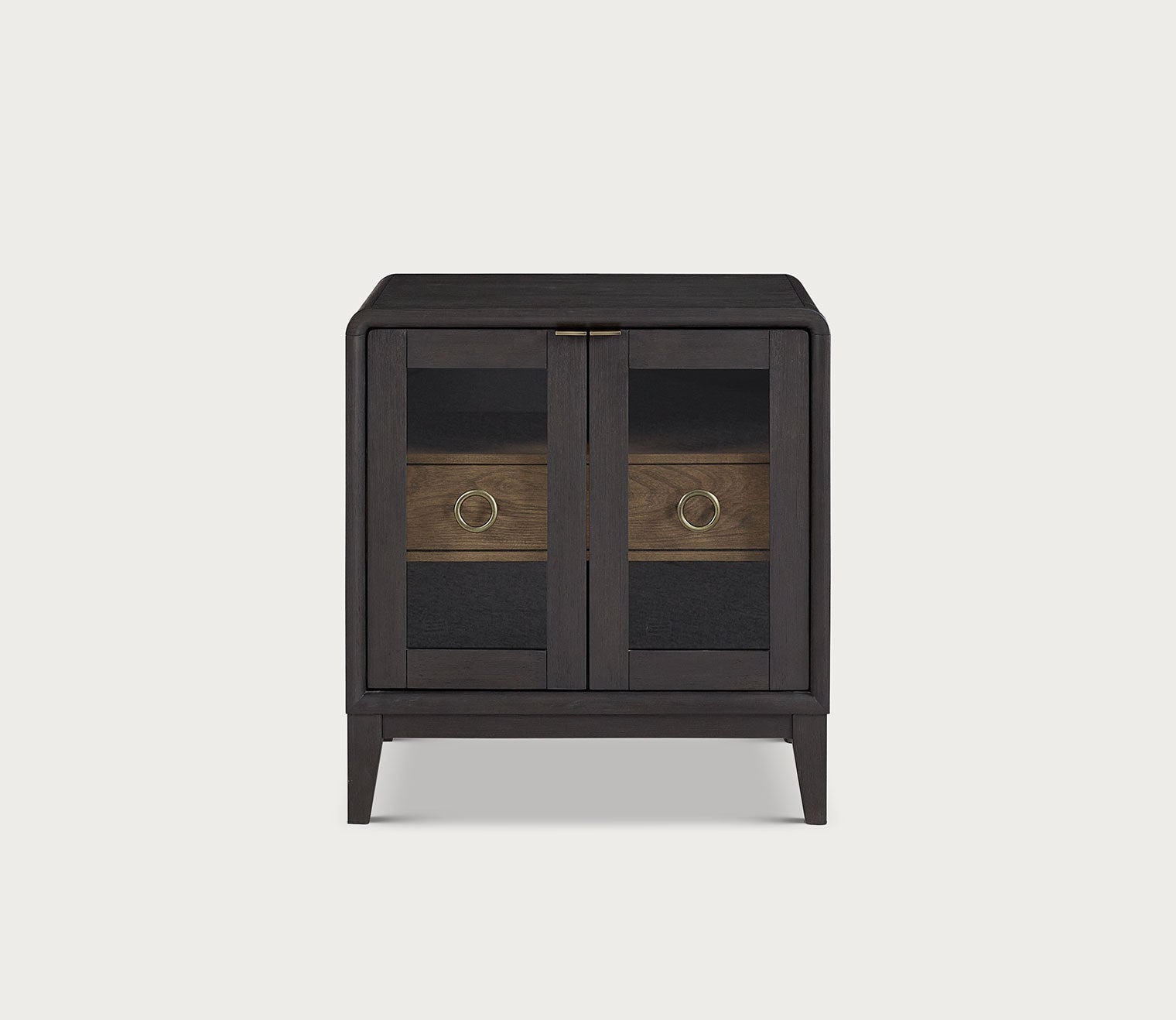 Complete your bedside setup with the uniquely modern design of Bernard Furniture’s Elure Glass Door Nightstand. Including a storage drawer in a contrasting latte finish behind the double glass doors, this 28-inch-wide black wood bedside table offers stylish intrigue and protected display space for your favorite décor and nighttime essentials. A contemporary masterpiece with high-quality materials, superior craftsmanship, and exceptional value— the rounded corners combined with the rich peppercorn black finish exude sophistication.