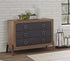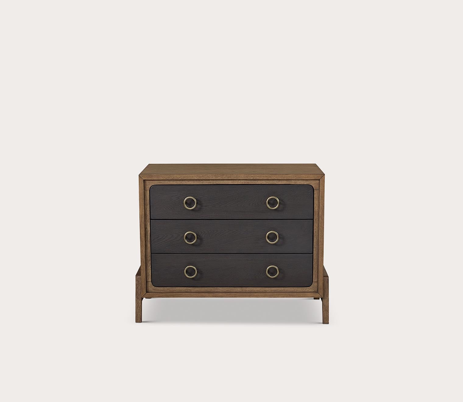 Elevate your bedroom organization and style with Bernards Furniture’s Elure Wood Bachelor Chest, featuring clean, modern lines and minimalist design elements. A versatile and spacious storage piece for tucking away personal items, clothing, and more, this 38.5-inch wide chest of drawers features a solid rubberwood and poplar frame with elm veneer for exceptional durability and superior craftsmanship. The three stacked drawers with a rich peppercorn black finish create a grounding presence, while the warm latte brown frame adds a hint of inviting warmth.