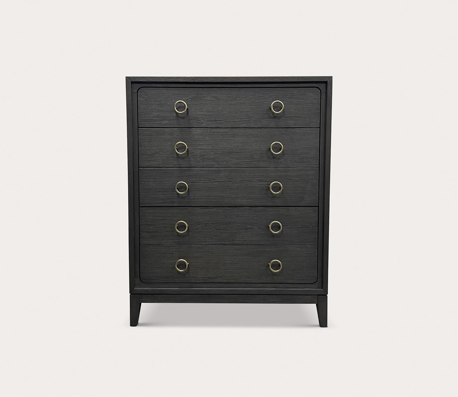 With rounded corners that soften each edge, this 54-inch tall chest of drawers transforms your bedroom sanctuary with high-quality materials, superior craftsmanship, and exceptional value. Made from solid rubberwood and poplar with elm veneer for enduring strength, the rich peppercorn black finish grounds your space with visual depth and luxe character.