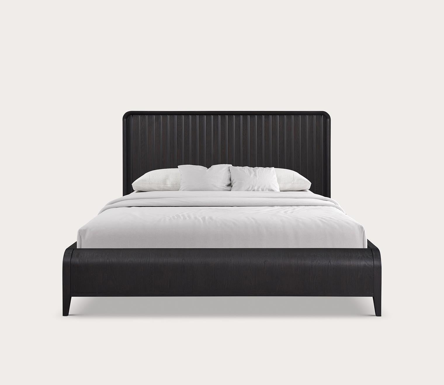 Crafted from solid rubberwood and poplar for enduring strength alongside elm veneer, this black wood panel bed in queen or king size features a 54-inch headboard with elegant, rounded edges and stunning vertical slats that draw the eye upwards. The curved waterfall footboard adds a touch of graceful movement, while the black peppercorn finish offers sophisticated depth for a contemporary haven.