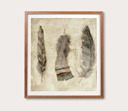 Adorn empty wall space with the soft, gentle style and detailed artwork of Grand Image’s Feather Heirloom 2 Digital Fine Art Print by talented artist Sarah Atkinson. Elegantly framed in walnut wood for a finished look, this 30 x 27.5-inch wall art print on premium archival paper showcases three floating feathers in a neutral-hued palette of beige, grey, brown, and green against a weathered background. Masterfully hand-deckled with delicately torn edges, the ready-to-hang wall decor piece is floated on a mat and set under glass.