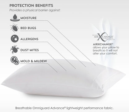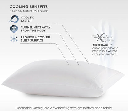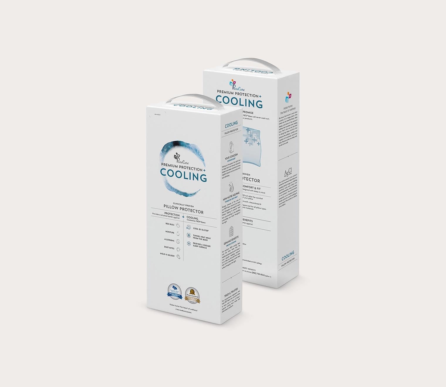 Stay refreshed and sleep healthier with Pure Care’s Frio waterproof pillow protector featuring cooling properties and allergen-inhibitors. Designed with FRíO® technology, this cooling pillow cover utilizes a proprietary blend of minerals to disperse heat five times faster. Keeping your pillow protected from all angles, the 360° barrier, coupled with MiteTight® seams and the OmniGuard® performance fabric, prevent dust mites, bed bugs, and moisture from affecting your perfect night’s rest.