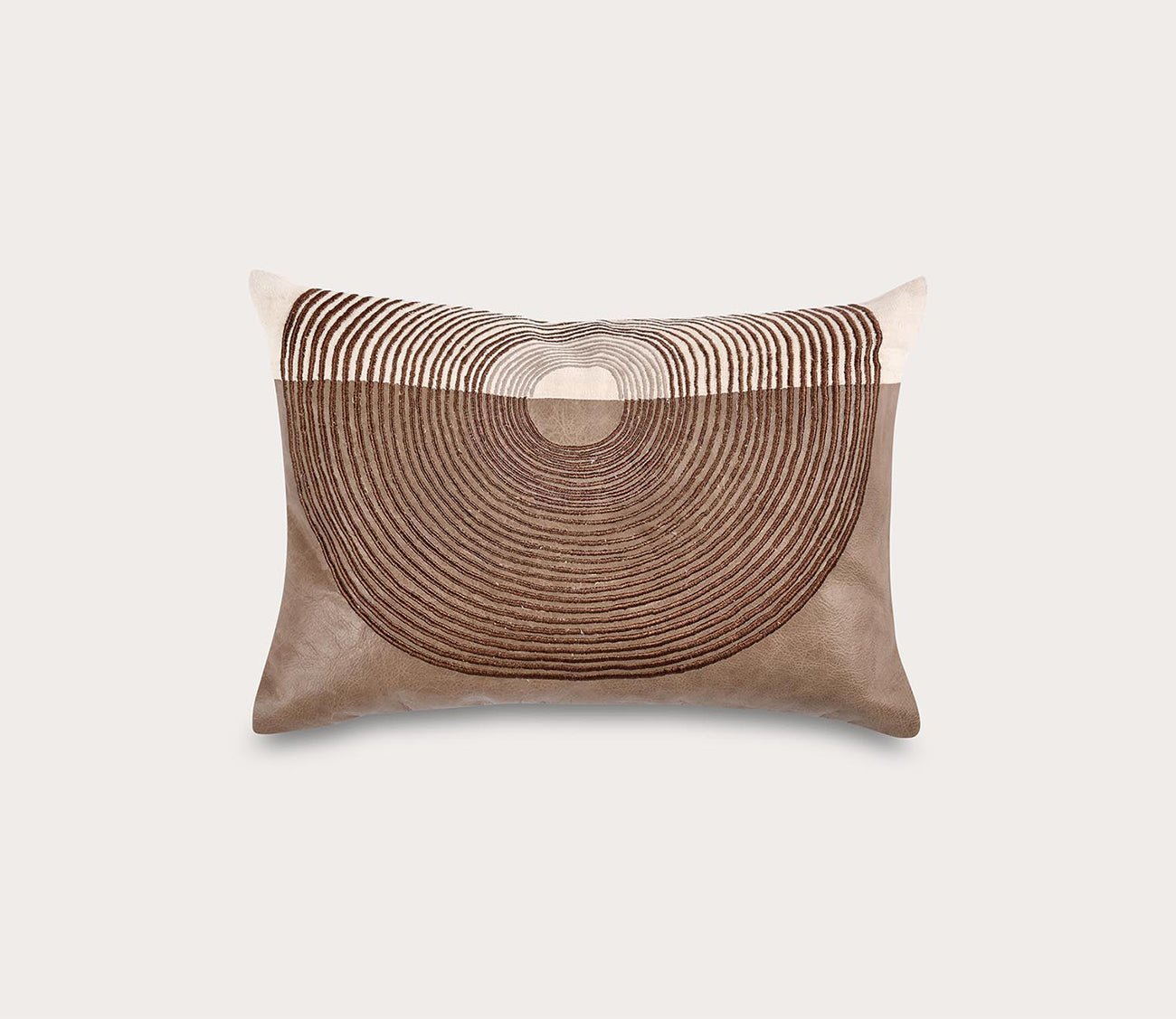 Ensuring an unmatched level of softness and support— this decorative accent pillow includes a luxury feather and down blend insert for cozy relaxation. The removable cover, crafted from pieced genuine leather and Belgian flax linen, showcases an embroidered circular design adorned with gold metallic embellishments.