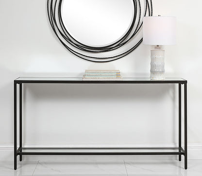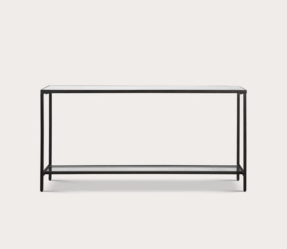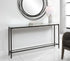 - Inset with a beveled mirrored top and gallery shelf in clear glass.