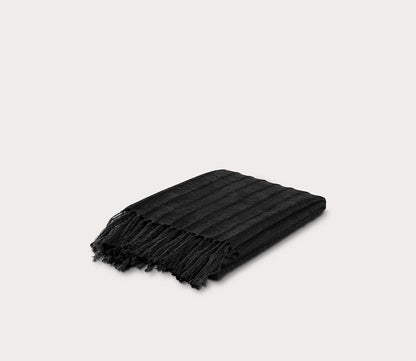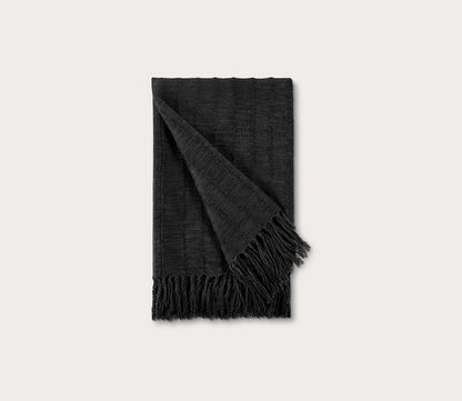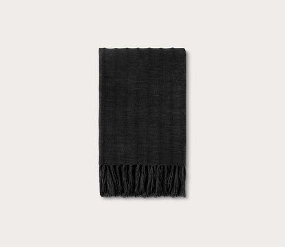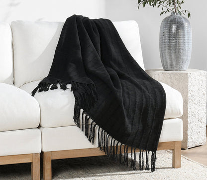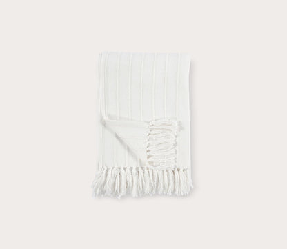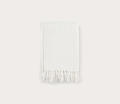- Textured white cotton throw blanket with fringe