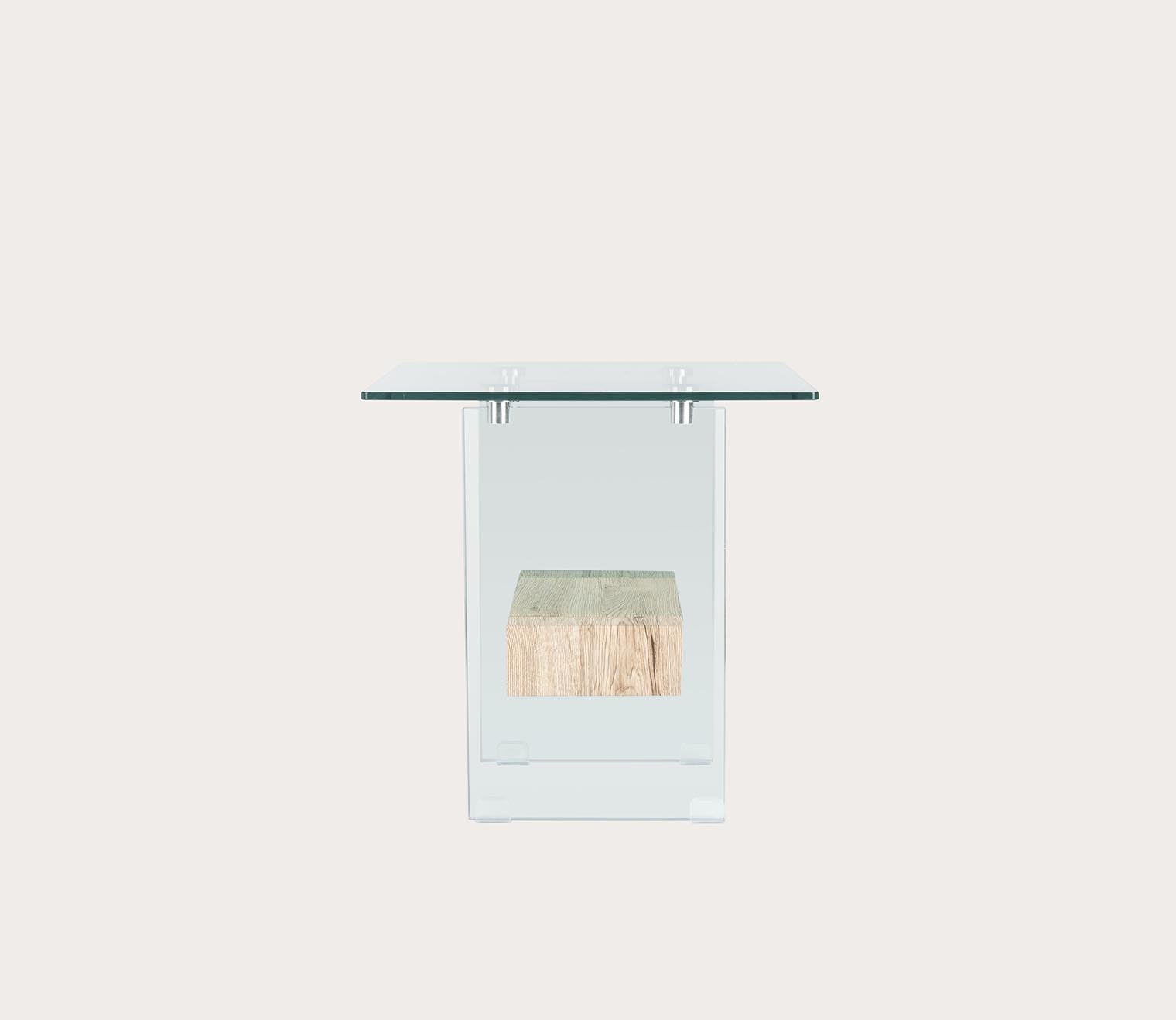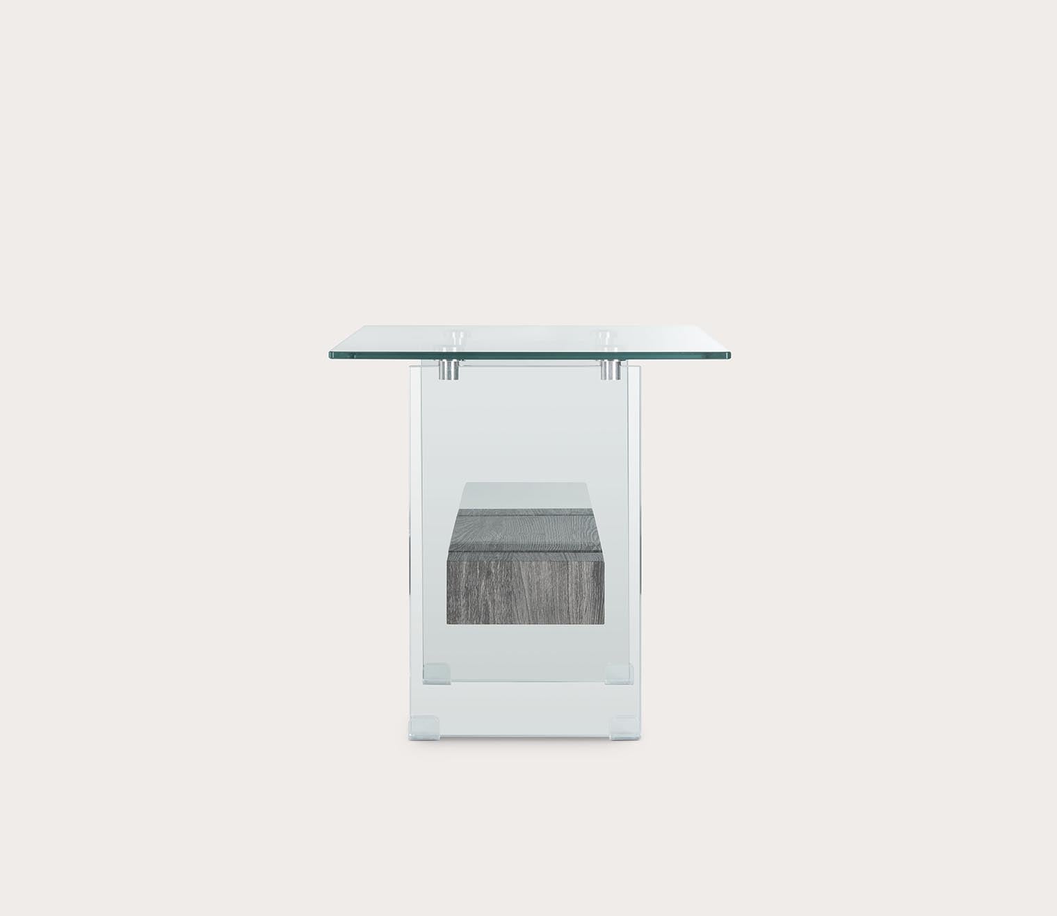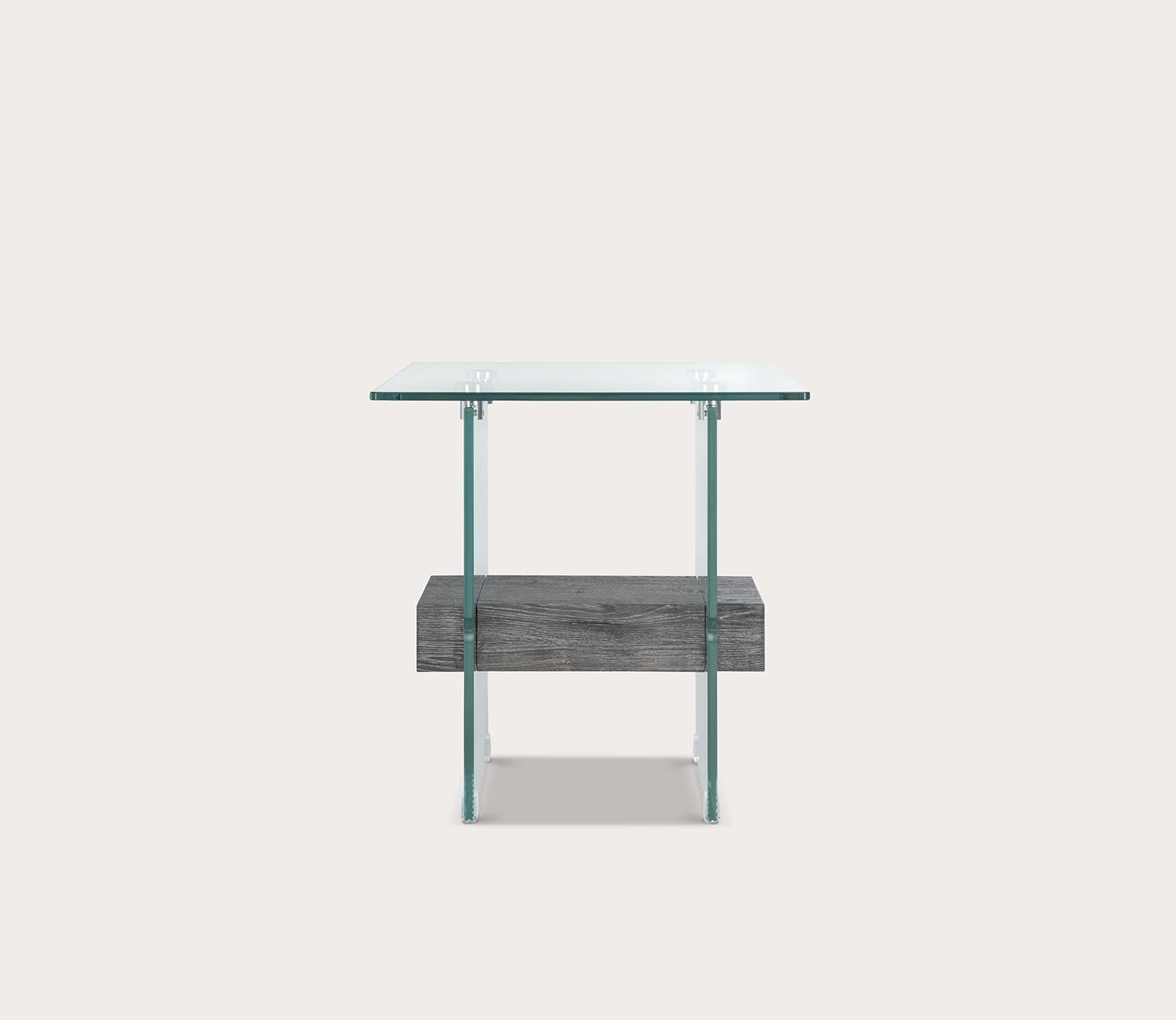 Unassuming with high-end elegance, this decorative side table features a 19.7-inch shape with a clean-lined silhouette crafted from crystal clear glass. The thick wood shelf brings stark contrast with a floating look in a natural or black oak finish.