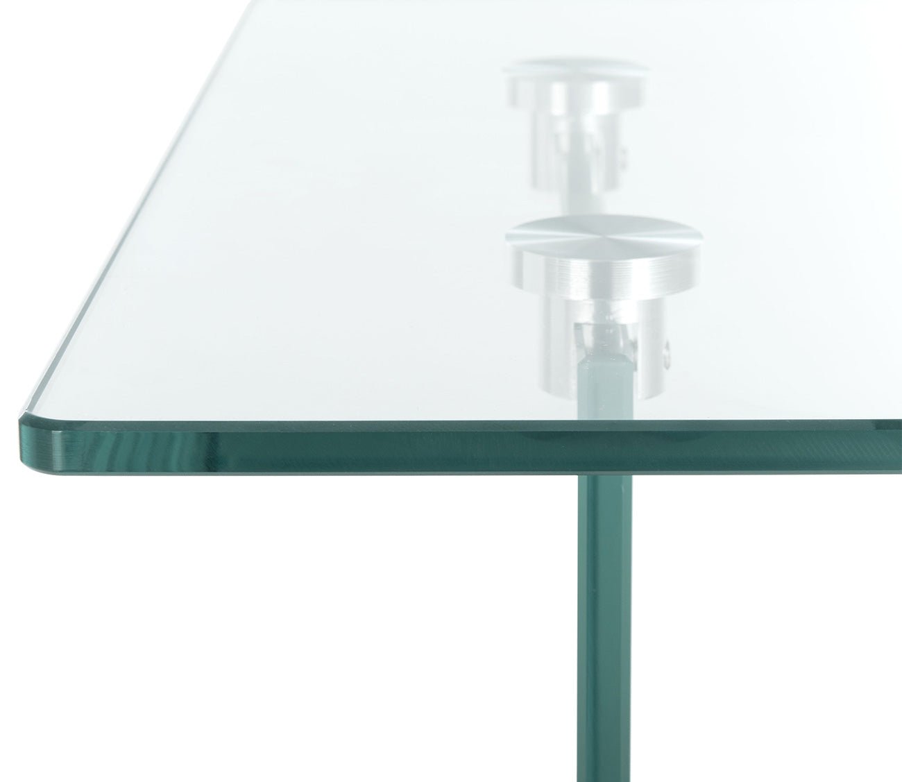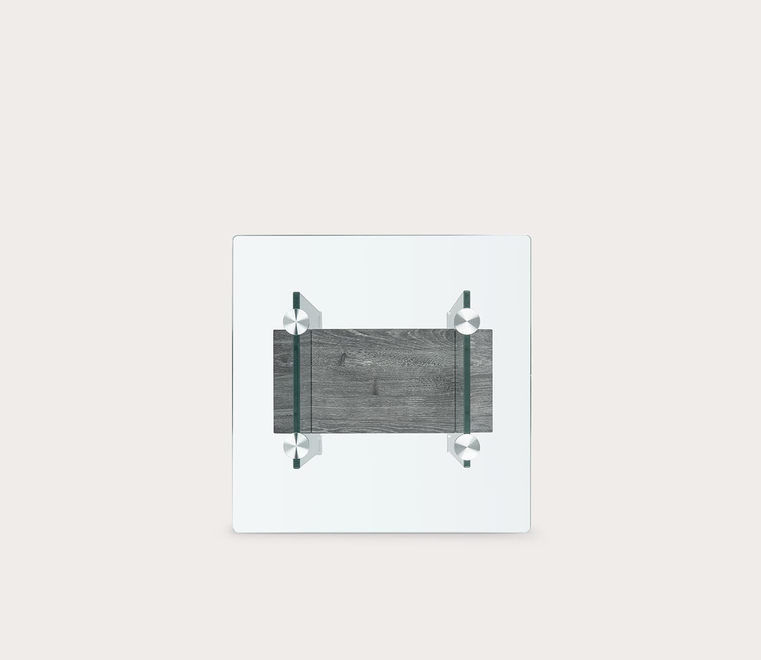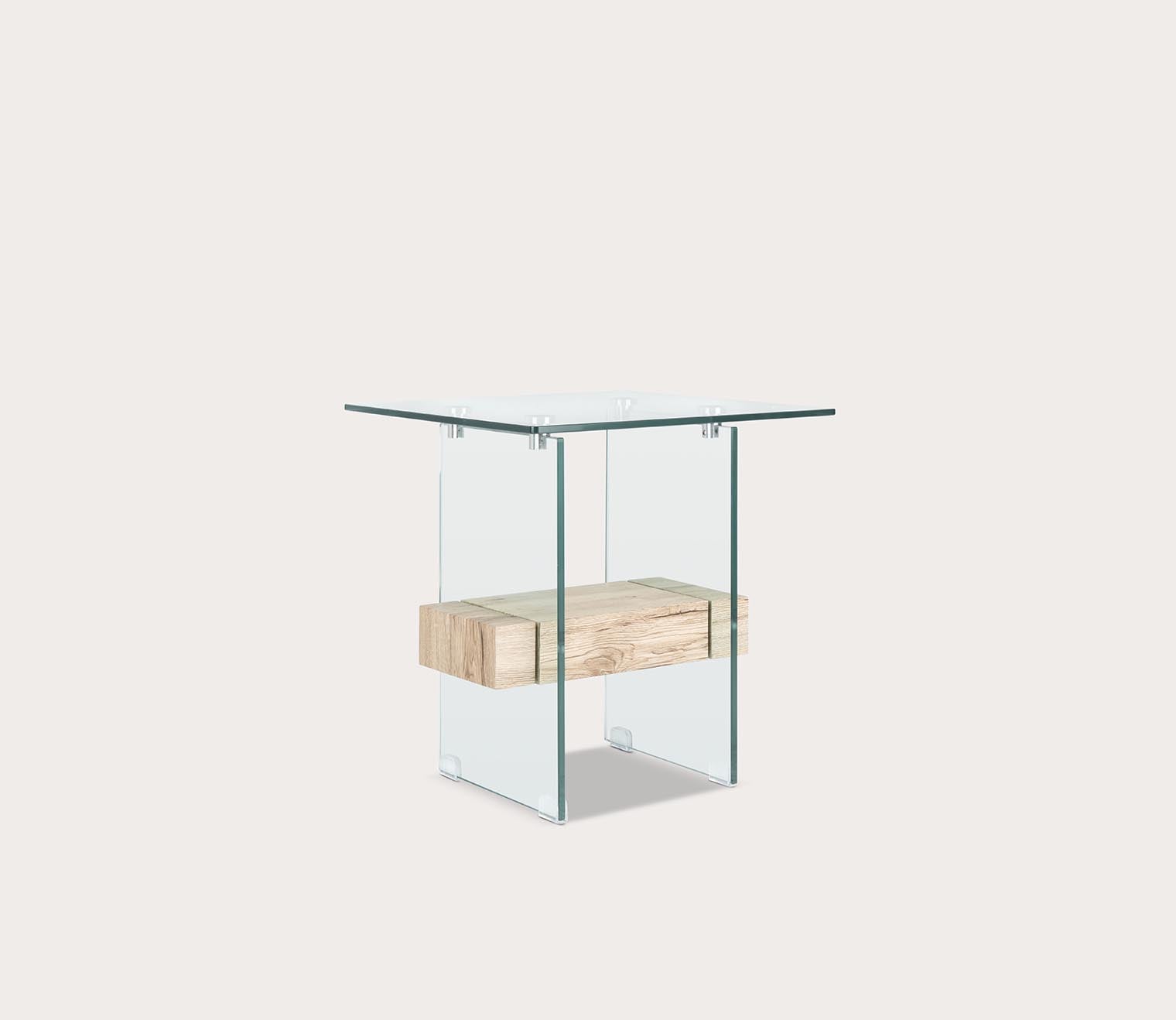 Unassuming with high-end elegance, this decorative side table features a 19.7-inch shape with a clean-lined silhouette crafted from crystal clear glass. The thick wood shelf brings stark contrast with a floating look in a natural or black oak finish.