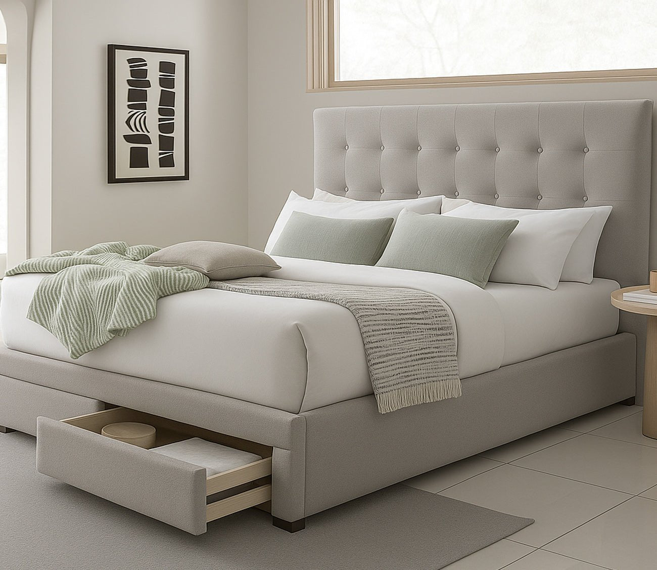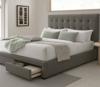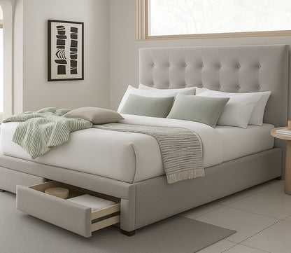Bring timeless elegance to your bedroom with the Kemper Button Tufted Upholstered Bed — a perfect blend of classic charm and modern functionality. The rectangular headboard, detailed with refined button tufting, creates a sophisticated focal point, while C-Zero Plus Performance Fabric by Crypton® offers sustainable softness and advanced stain resistance, free from harmful chemicals. Available in serene shades of stone, oyster, or bone, and offered in three versatile configurations: Storage Bed with smooth-gliding drawers for seamless organization, Non-Storage Bed for a streamlined profile, or Headboard Only to pair with your existing base.