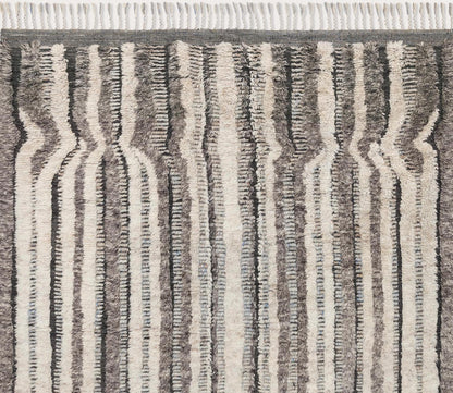 Anchor your space with the rich sense of contrast and diverse texture of Loloi's Khalid Stone Charcoal Area Rug, available in a 6 x 9 or 8 x 10 size. Hand-knotted in India by skilled artisans, this handmade area rug features a Moroccan-inspired design with natural, undyed wool and nylon yarns of varying pile heights that incorporates plush flokati-style shag alongside a low woven base. With braided fringes at either end, the neutral stripes stretch the length of the rug and gently waver in a fluid sense of motion.