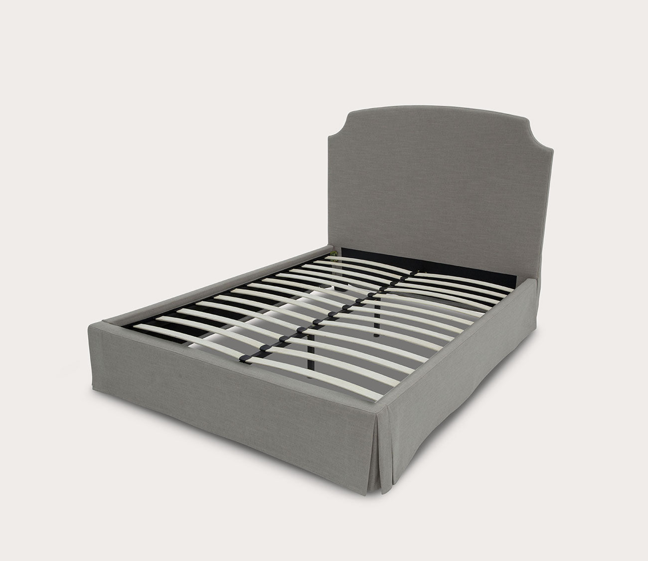 Classy and chic with modern appeal, this slipcover platform bed includes a 58-inch headboard with clipped corners and natural beige wheat-hued linen-blend fabric upholstery over the entire silhouette. The skirted base with inverted corner pleats finishes for a tailored look, while European-style bentwood slats ensure durable mattress support.