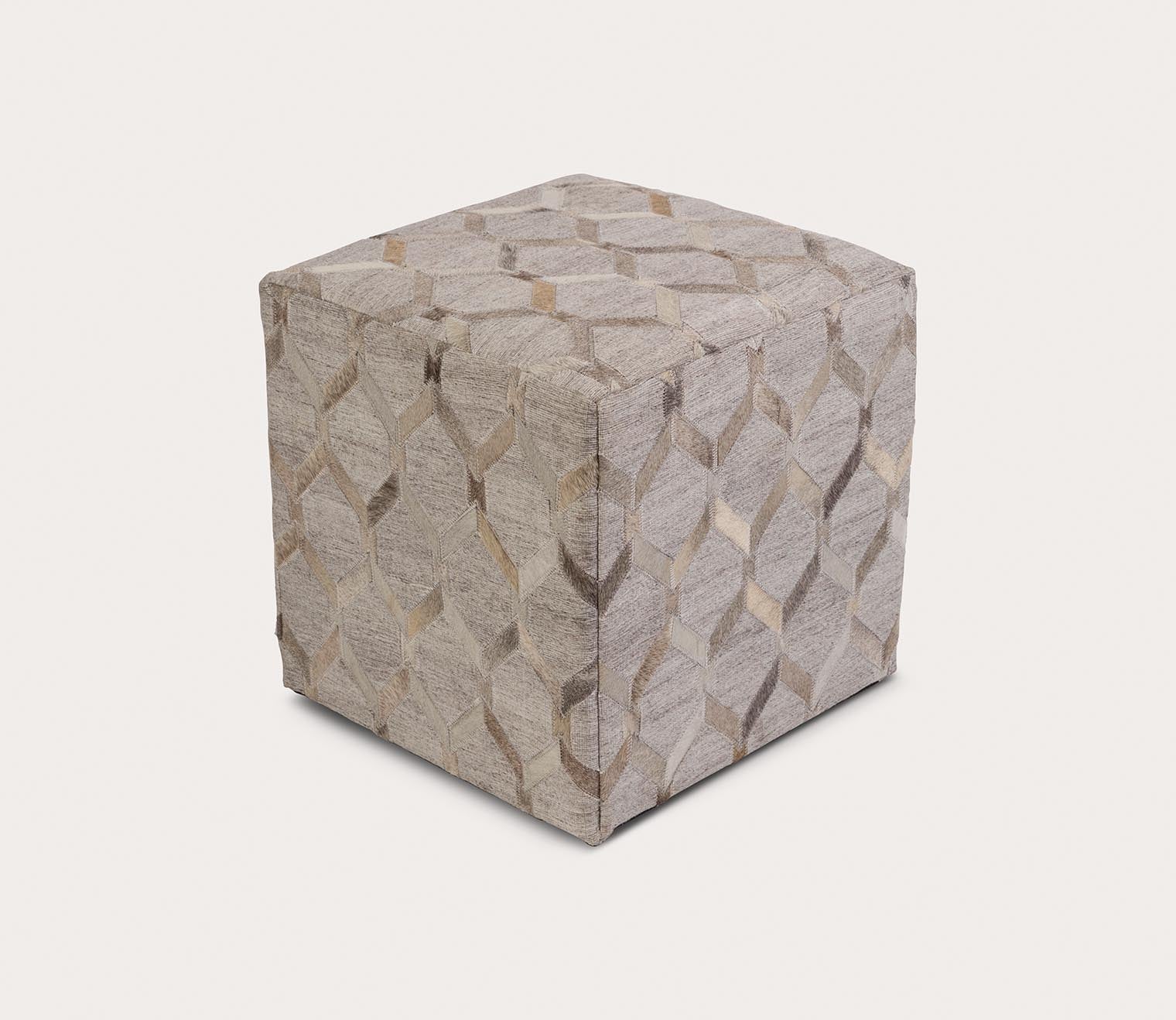 Carefully stitched and intricately crafted in India, Surya’s Medora Ottoman brings a rustic, organic home accent to your interior space. Uniquely designed with eye-catching character, this 18-inch square pouf features a cube shape and a compact size that easily moves from room to room and provides versatility as a footrest, side table stand-in, or spare seat. The pieced patchwork design of natural hair on genuine hide forms a mesmerizing geometric pattern, while polystyrene block filling and a wood frame ensure supportive durability.