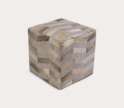 The perfect match for your seating arrangement, Surya’s Medora Patched Ottoman brings unique style and versatility as a footrest, side table stand-in, or spare seat. With an 18-inch square cube shape, this leather pouf is made in India with a pieced patchwork design of natural hair on genuine hide in an angular chevron-style pattern. The polystyrene block filling provides supportive cushioning, while the wood frame ensures lasting durability.