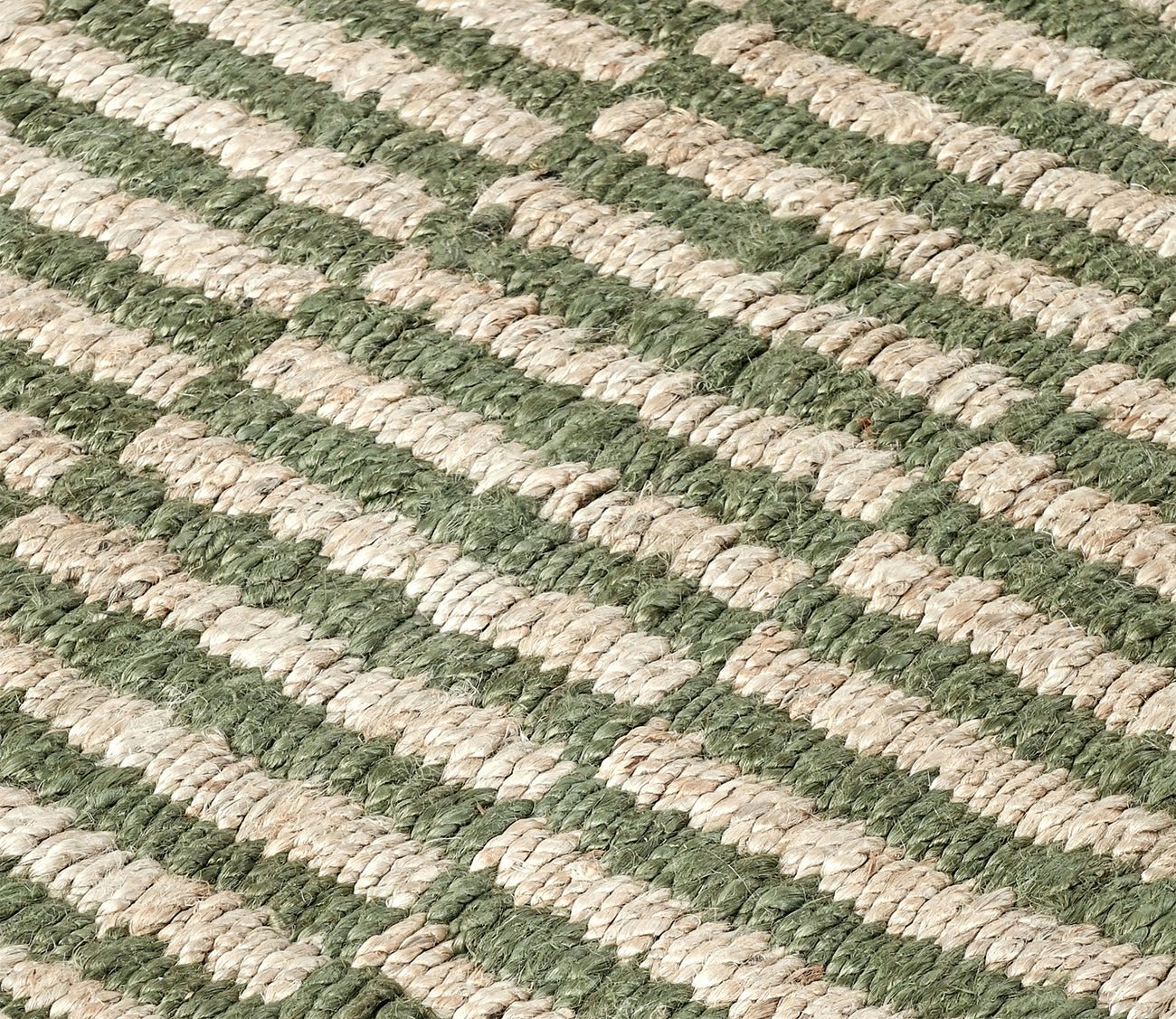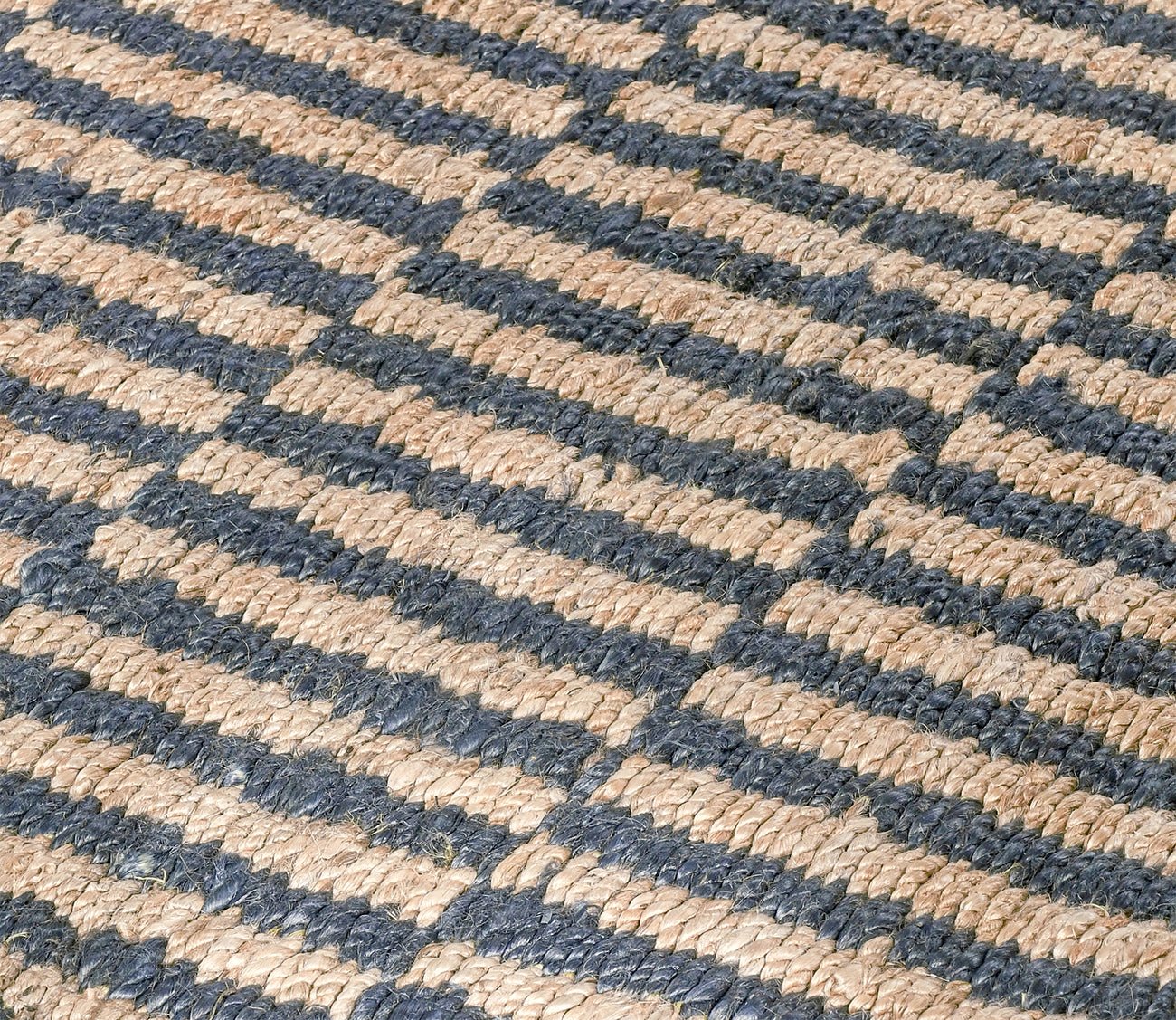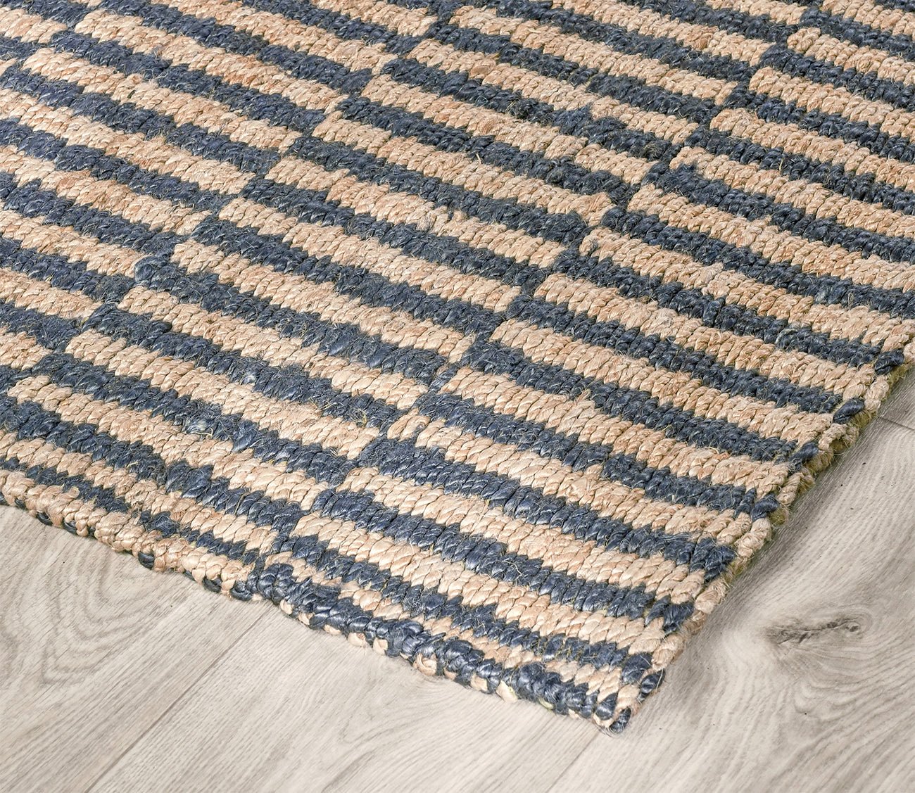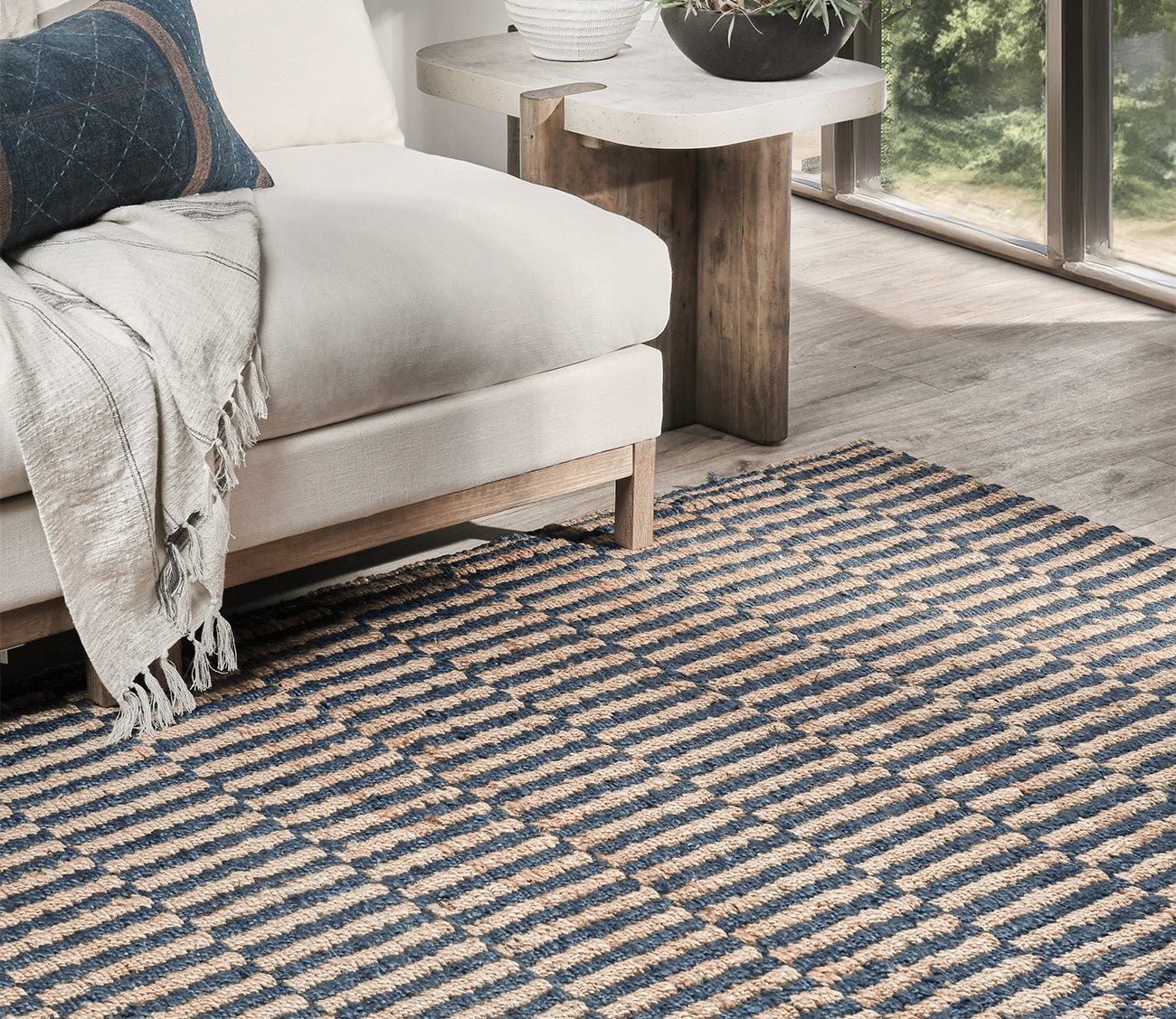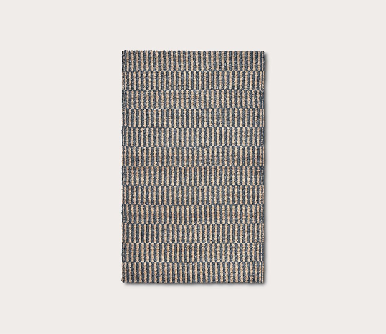 Available in an 8 x 10 or 5 x 8 size, this handwoven area rug features a modern mixed tile stripe pattern in natural with blue or green hues. Made from sustainable 100-percent jute— we suggest using a rug pad beneath to prevent shifting and add extra cushioning.