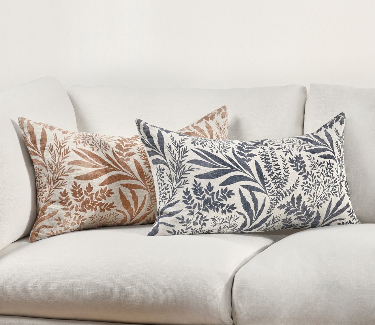 Available in a 14 x 26-inch rectangular lumbar shape, this decorative toss pillow features a removable cover with a zip closure and softly textured 100-percent Belgian flax linen fabric. Including a luxury feather and down insert— the hand-painted leafy botanical watercolor pattern pops in a denim blue hue.