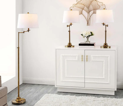 Embrace the beauty of clean lines and simplistic elegance with Safavieh’s Nadia Gold Floor Lamp, featuring a timeless swing arm design. Complete with a metal base and luxuriant touches, this decorative floor lamp has an adjustable height ranging from 53 to 64.25 inches. The white cotton shade highlights the soft glow of the bulb’s illumination.