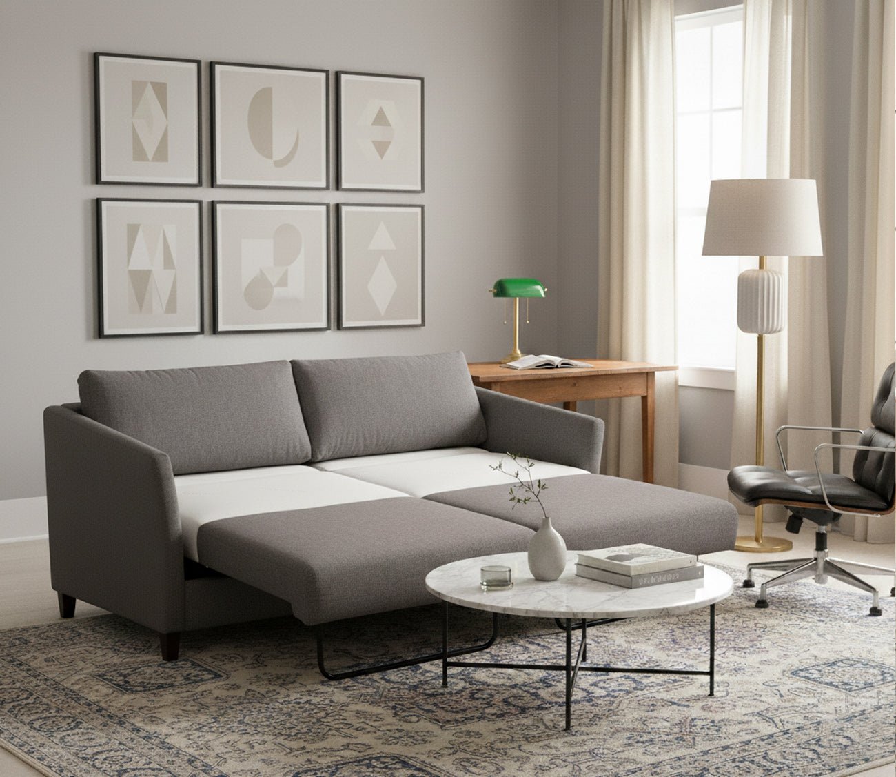 Designed with a clean, contemporary profile, this convertible sofa transitions effortlessly from everyday seating to a comfortable queen- or king-size sleep surface. Its compact footprint makes it