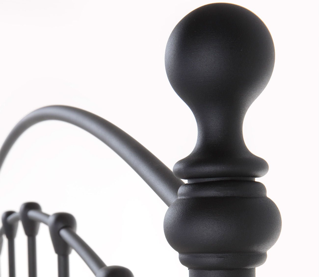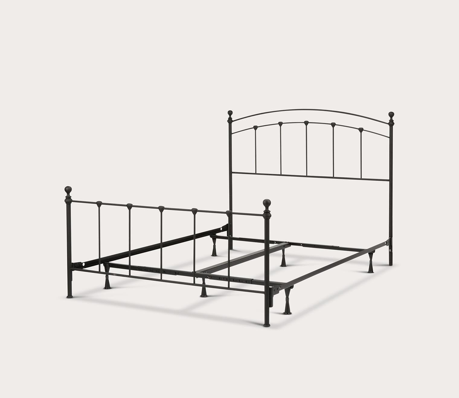Finished in a powder-coated matte black finish that mutes and plays with light, the curved headboard and straight footboard crafted from heavy steel metal showcase open frame silhouettes with narrow spindles and elegant finial posts. Timeless and traditional with versatile style— the ten castings locked in place on the bed feature an intentionally matched finish to emphasize the simplistic appeal.