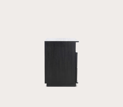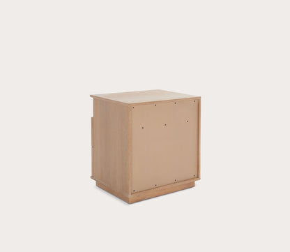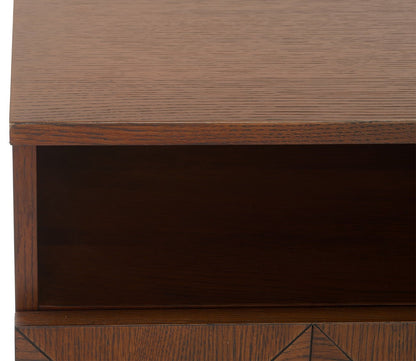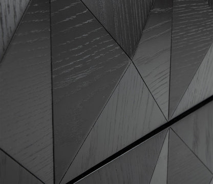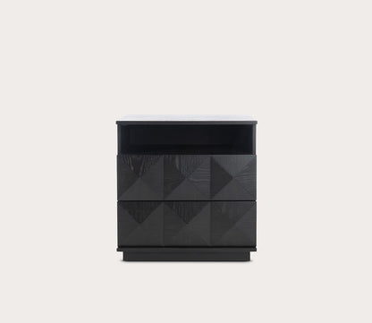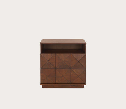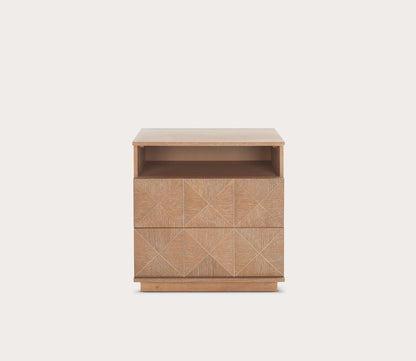 - Solid wood, 2-drawer nightstand with geometric patterns.